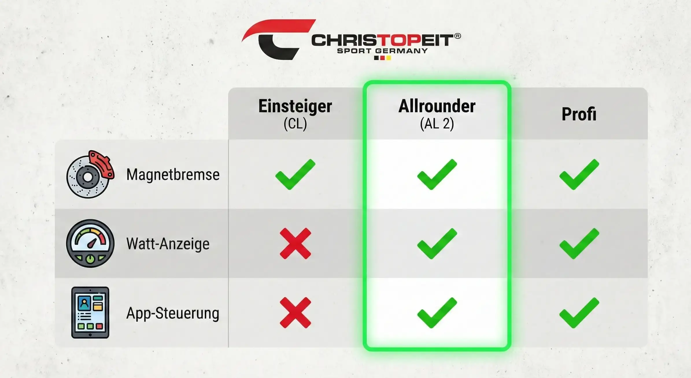 Hier müssen wir Erwartungsmanagement betreiben. Echte Induktionsbremsen, die extrem leise sind und eine eichgenaue Watt-Steuerung bis in hohe Bereiche ermöglichen, finden Sie bei Christopeit fast nur im oberen Preissegment oder gar nicht. Die Masse der Geräte setzt auf das bewährte Magnetbremssystem.