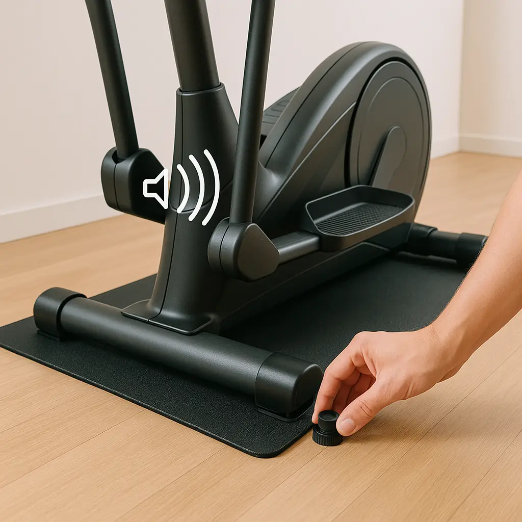 - Aufstellung: Stellen Sie den Crosstrainer auf einen ebenen Untergrund und nutzen Sie die verstellbaren Füße zum Ausgleich von Unebenheiten. Eine Bodenschutzmatte dämpft Vibrationen und schützt den Boden.