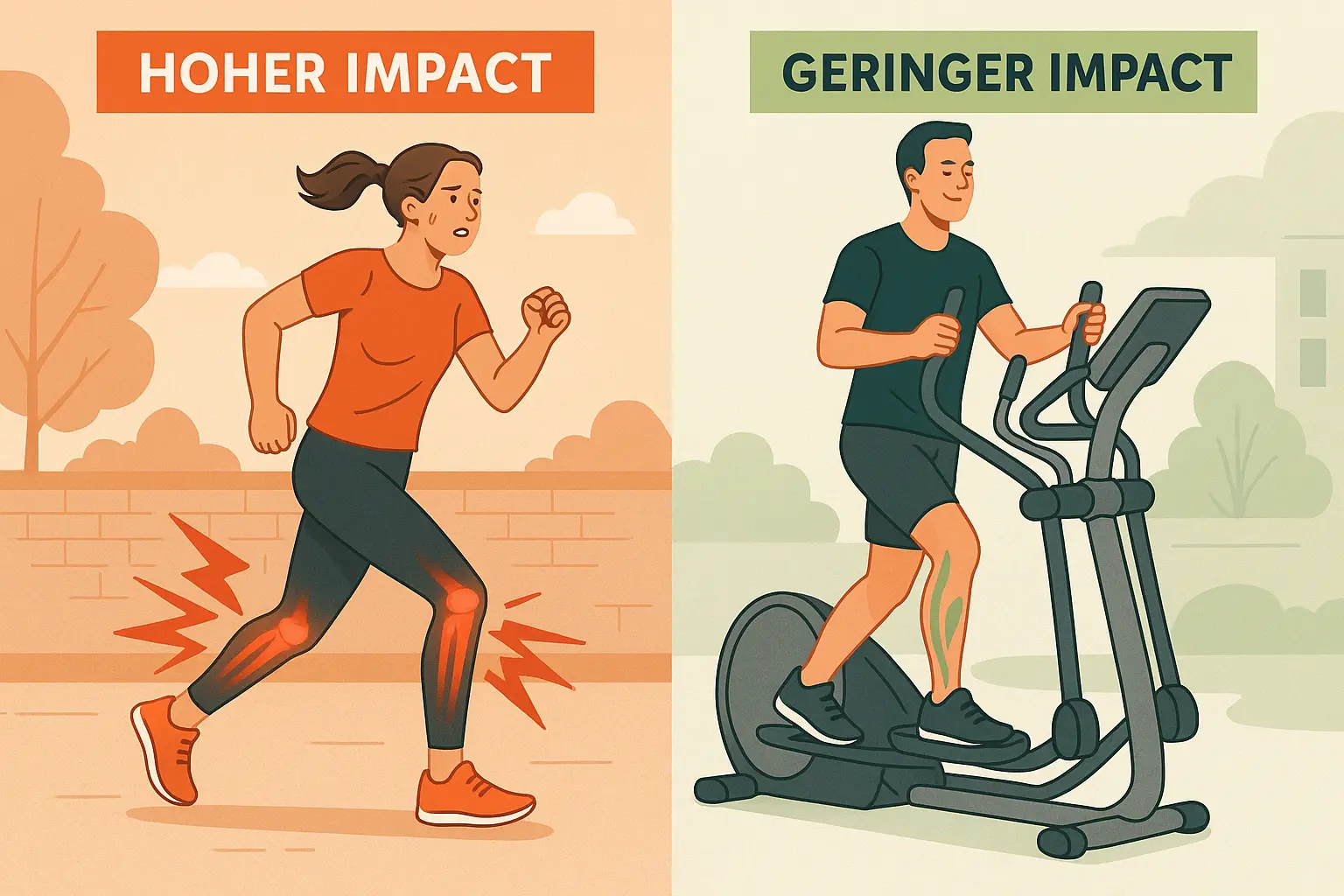 Hier liegt der markanteste Unterschied. Beim Joggen wirken bei jedem Schritt Stoßkräfte vom 2,5- bis 3-fachen des eigenen Körpergewichts auf Füße, Knöchel, Knie, Hüfte und Wirbelsäule. Diese hohe Belastung (Impact) ist einerseits ein starker Reiz für die Knochen, der die Knochendichte fördert, andererseits aber auch das Hauptrisiko für Überlastungsschäden und Verletzungen.