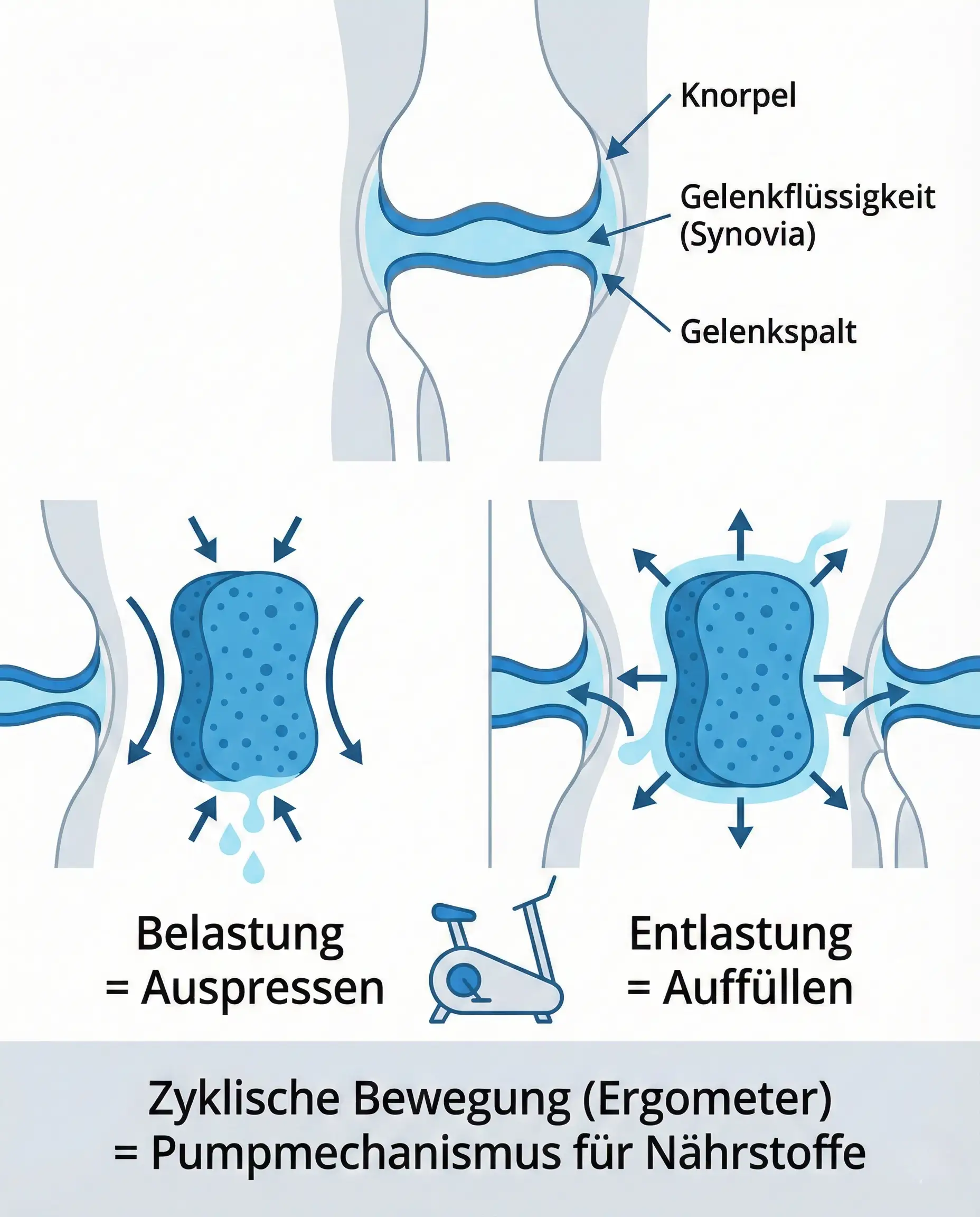 Das Ergometer-Training dient hier primär der Schmerzlinderung durch Mobilisation. Durch die Bewegung wird Synovialflüssigkeit produziert, die wie ein Ölfilm die aufgerauten Flächen gleitfähiger macht. Viele Patienten berichten, dass sie nach 15 Minuten lockerem Radeln weniger Schmerzen haben als davor.