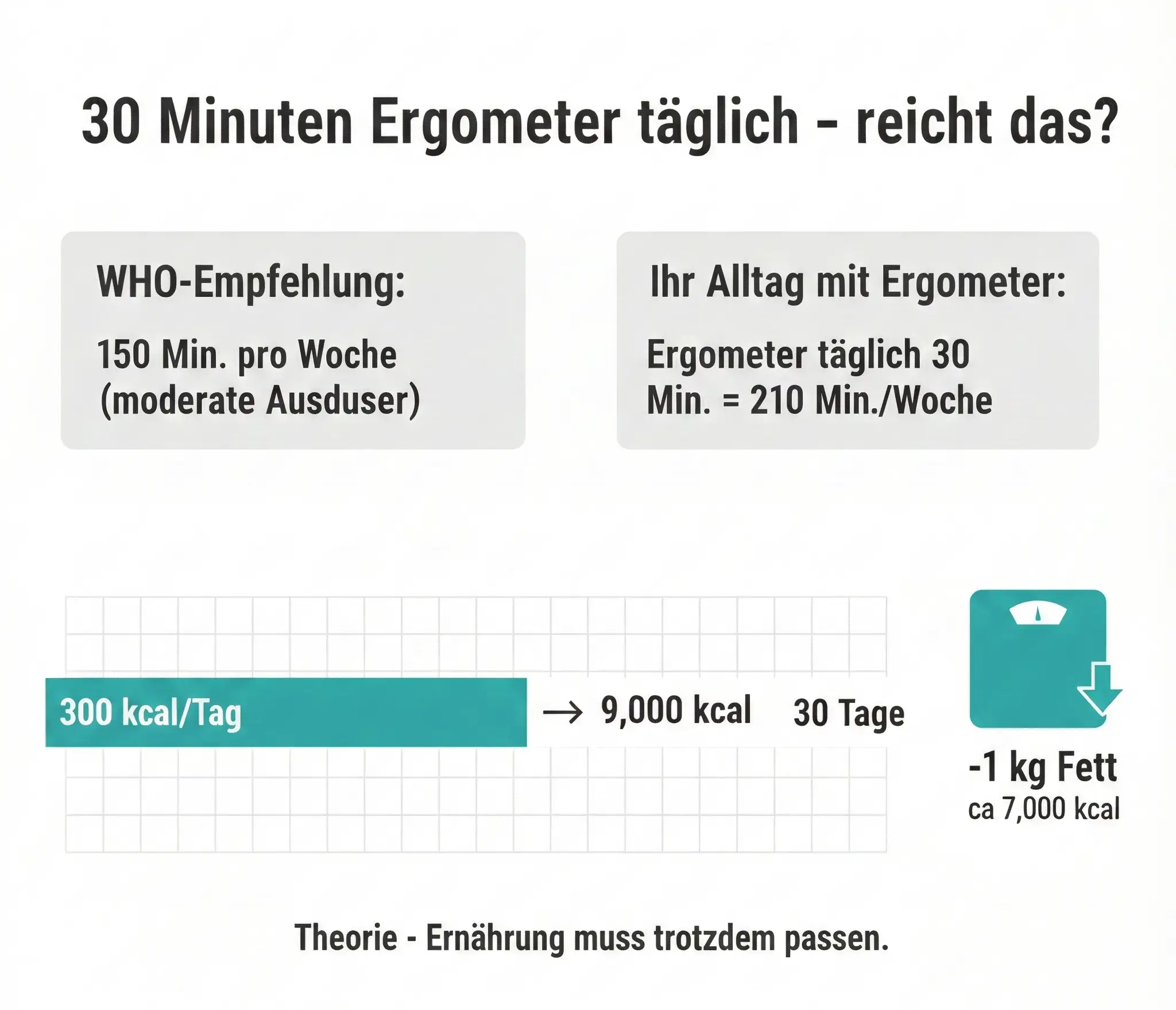 Die Weltgesundheitsorganisation (WHO) empfiehlt mindestens 150 Minuten moderate Ausdauerbewegung pro Woche. Mit 30 Minuten Ergometer-Training jeden Tag kommst du auf 210 Minuten. Du übererfüllst die Norm für Herzgesundheit also deutlich.