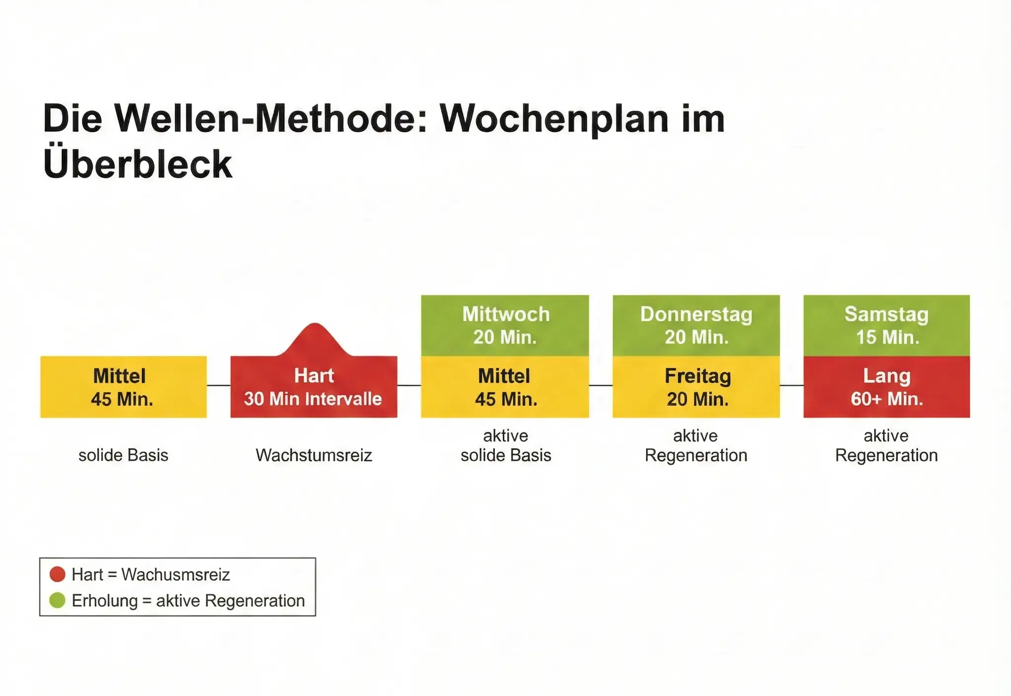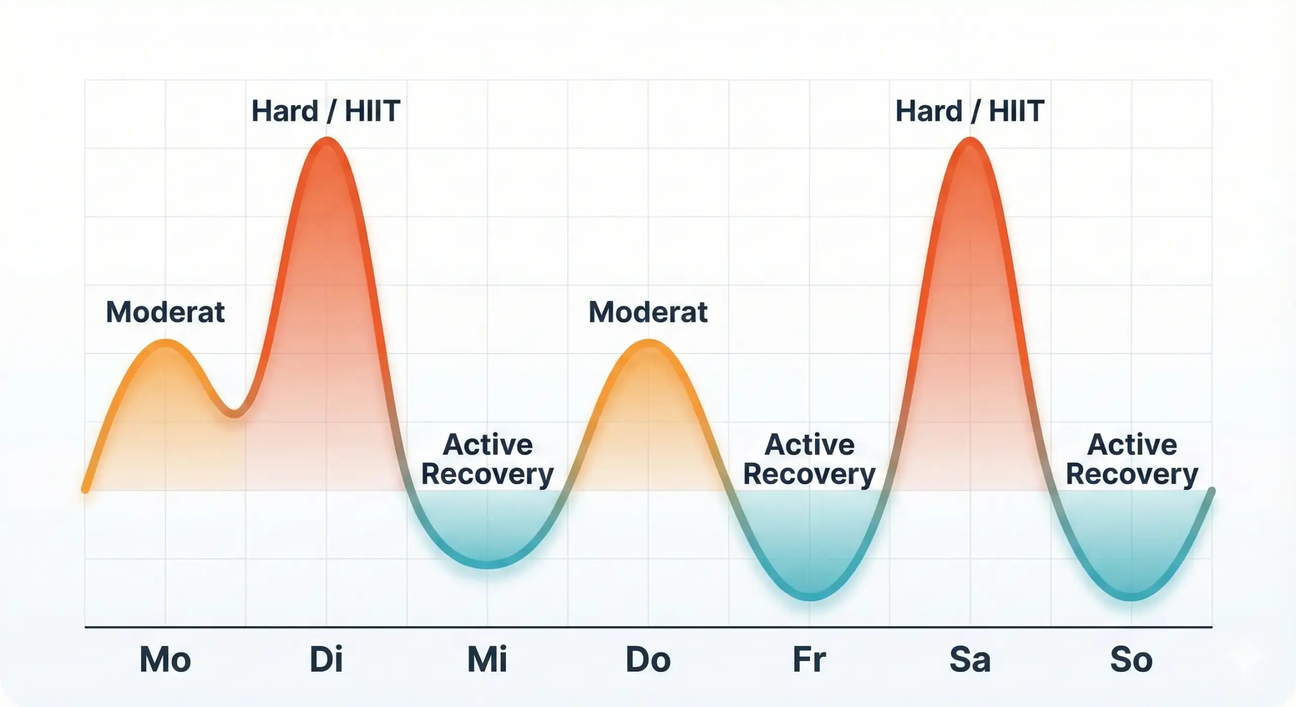 Dieser Plan sorgt dafür, dass du jeden Tag „drin“ bist, aber deinem Körper genug Zeit gibst, die harten Reize (Dienstag und Samstag) zu verarbeiten.