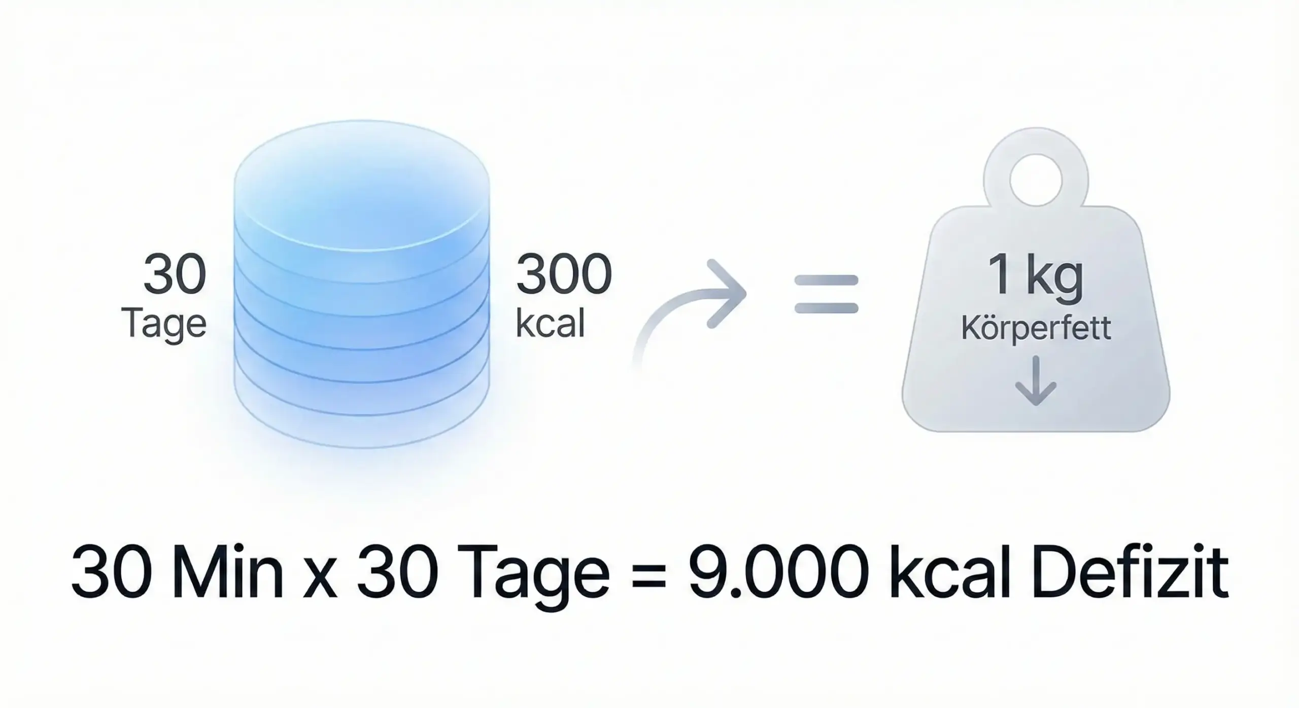 - Theoretisch verlierst du also mehr als 1 kg reines Fett pro Monat, nur durch diese 30 Minuten täglich – ohne Diät.