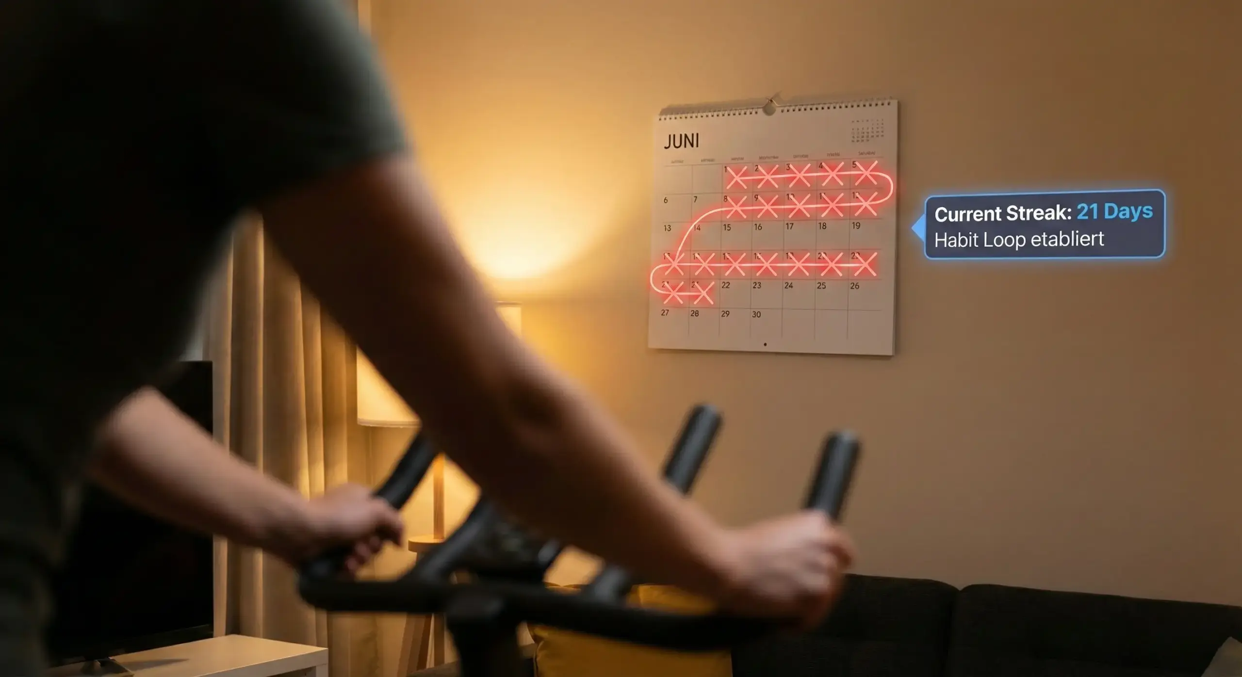An schlechten Tagen, wenn du müde bist und es regnet, ist die Überwindung riesig. Aber der Blick auf den Kalender mit 20 Kreuzen in Folge motiviert. Du setzt dich drauf – und wenn es nur für 10 Minuten ganz locker ist.