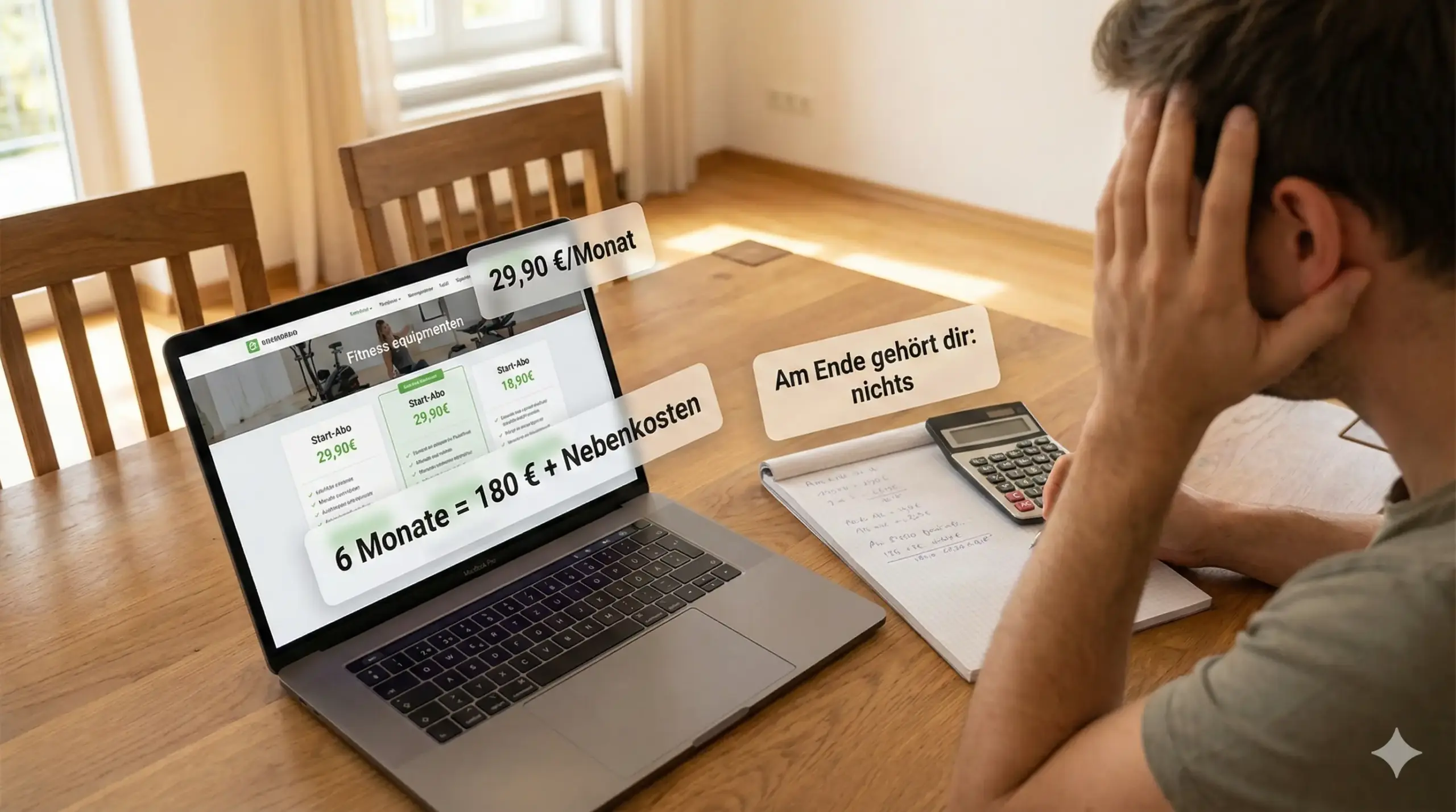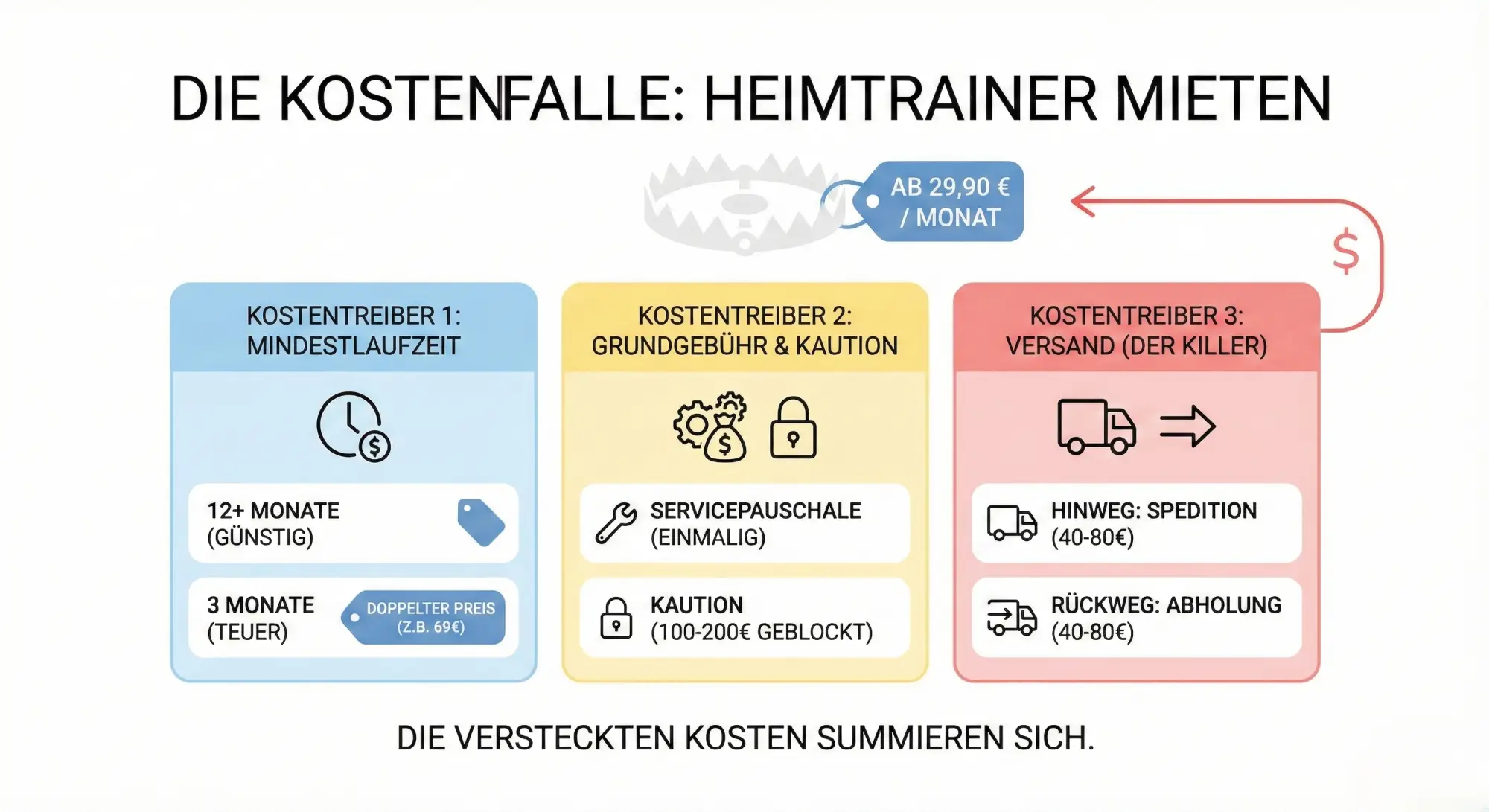Kommen wir zum Kern des Problems. Warum raten wir oft davon ab, einen Heimtrainer zu mieten? Das Problem ist nicht die monatliche Rate allein, sondern die Summe der Nebenkosten, die im Kleingedruckten stehen.