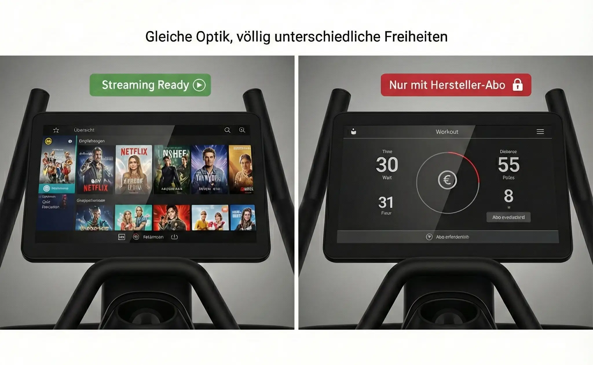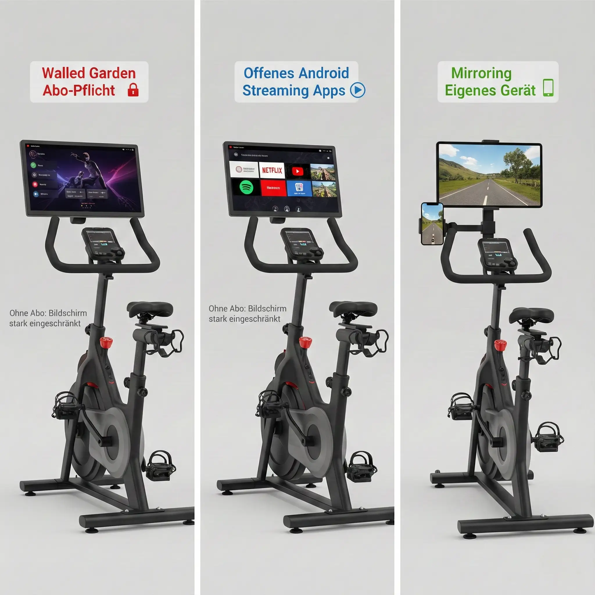 Weil die Hersteller das Betriebssystem „sperren“ (Kiosk-Modus). Sie wollen, dass du ihre Trainingssoftware nutzt, nicht dass du Friends schaust.