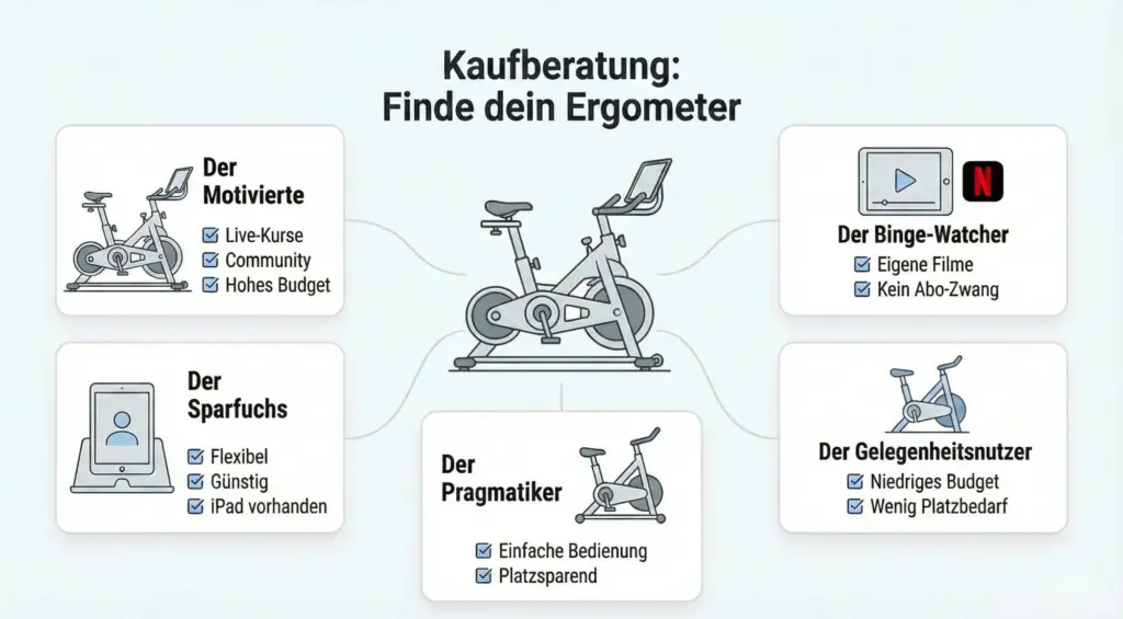 Wir haben den Markt gescannt. Hier ist eine Einordnung der aktuellen Top-Kategorien. Egal ob du ein Indoor Bike mit Bildschirm für Spinning-Sessions suchst oder ein klassisches Sitz-Ergometer.