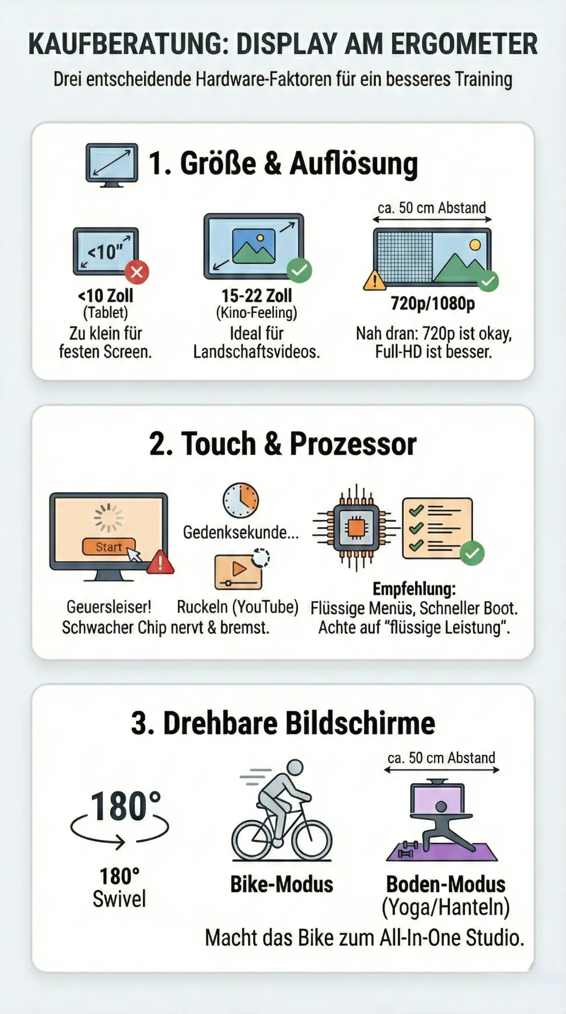 Wenn du den Bildschirm um 180 Grad drehen kannst, wird dein Bike zum All-in-One Fitness-Studio. Du steigst ab, drehst den Monitor und machst Yoga oder Hanteltraining vor dem Screen. Ohne Drehfunktion ist der teure Bildschirm für Bodenübungen nutzlos.
