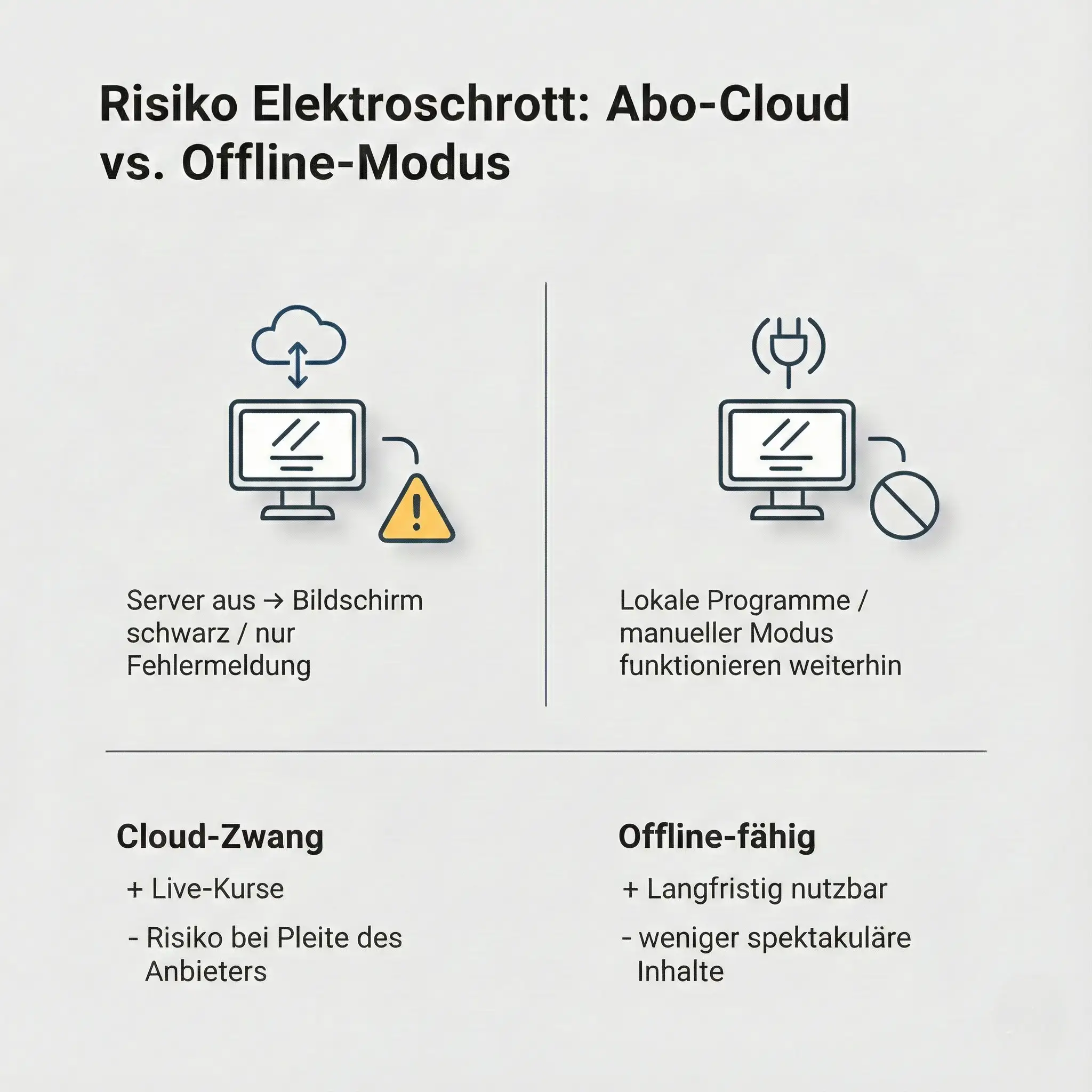 Das ist die Gefahr von „Elektroschrott“. Wenn der Bildschirm zwingend eine Server-Verbindung zum Hersteller braucht (Cloud-Zwang) und dieser die Server abschaltet, bleibt der Bildschirm schwarz oder zeigt nur noch eine Fehlermeldung.