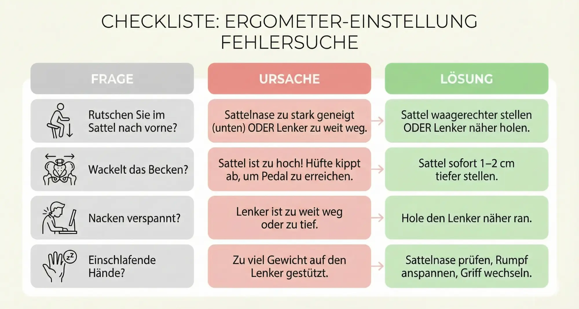 Selbst wenn du glaubst, alles richtig gemacht zu haben: Dein Körper gibt dir Feedback. Schmerzen sind oft ein direkter Hinweis auf eine falsche Geometrie. Hier ist unsere Diagnose-Liste für häufige Probleme.