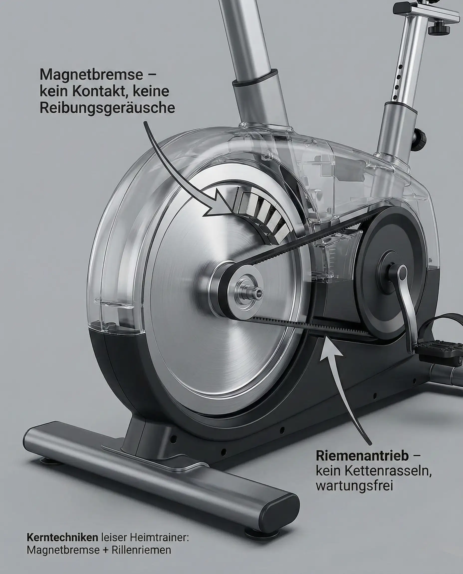Wenn du das absolute Maximum an Ruhe suchst, ist ein Ergometer mit Induktionsbremse (Wirbelstrombremse) die erste Wahl. Hier werden die Magnetfelder elektrisch durch eine Spule erzeugt. Diese Technologie arbeitet noch präziser und oft noch einen Ticken leiser als manuell verstellbare Magnetbremsen, da keinerlei Stellmotoren zu hören sind, wenn du den Widerstand wechselst.