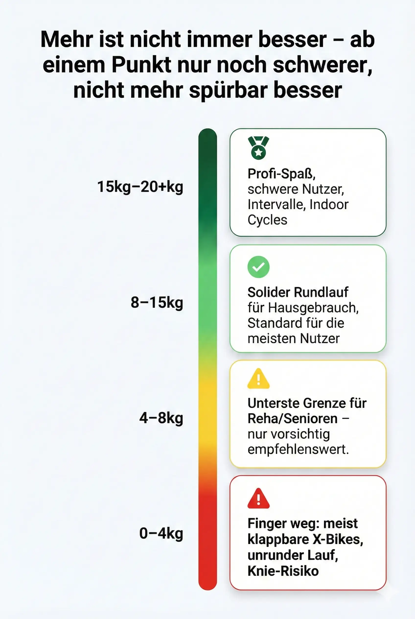 Es ist ein physikalisches Gesetz: Masse ist träge. Eine hohe Schwungmasse (ab 8–10 kg aufwärts) sorgt dafür, dass der Bewegungsablauf rund und gleichmäßig ist.