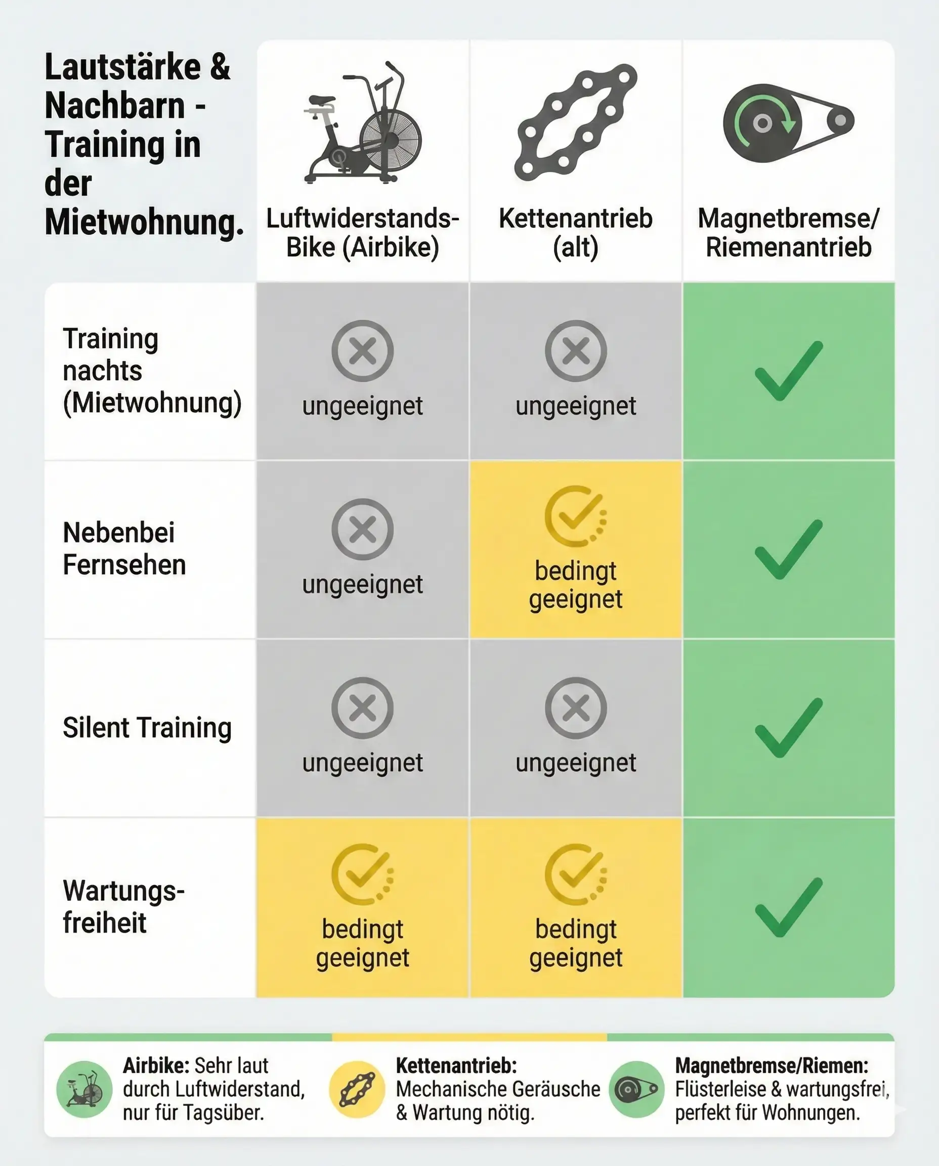 Lärm ist heute kein Argument mehr gegen Fitness in den eigenen vier Wänden. Die Technik hat sich massiv weiterentwickelt. Wenn du beim Kauf auf ein Magnet- oder Induktionsbremssystem und einen Riemenantrieb achtest, hast du die halbe Miete schon gewonnen.