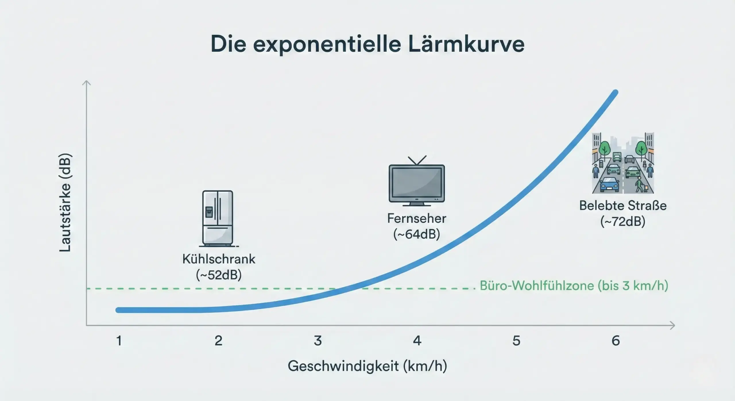 - Die Logarithmische Skala: Eine Erhöhung um nur 10 dB bedeutet physikalisch eine Verzehnfachung der Schallintensität. Für Deine Ohren klingt das wie eine Verdoppelung der Lautstärke. Der Sprung von 1 km/h (45 dB) zu 4 km/h (65 dB) ist also bereits eine Vervierfachung der empfundenen Lautstärke!