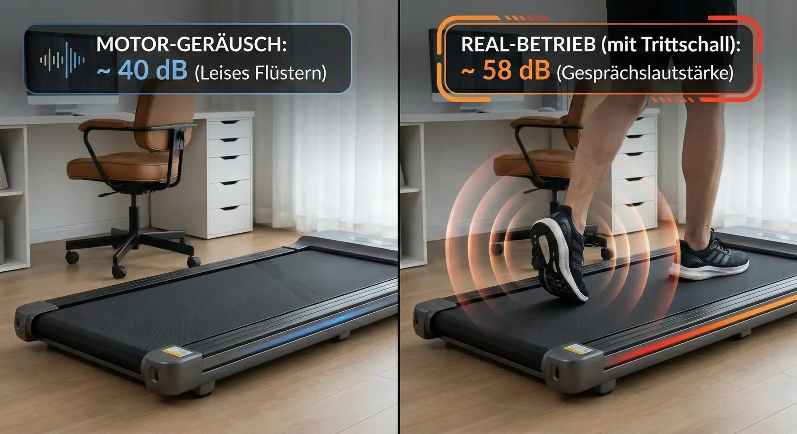 Hier ist eine Übersicht für ein durchschnittliches, geräuscharmes Walking Pad der Mittelklasse mit bürstenlosem Motor. Sie zeigt deutlich, wie massiv der Trittschall das Gesamtergebnis beeinflusst: