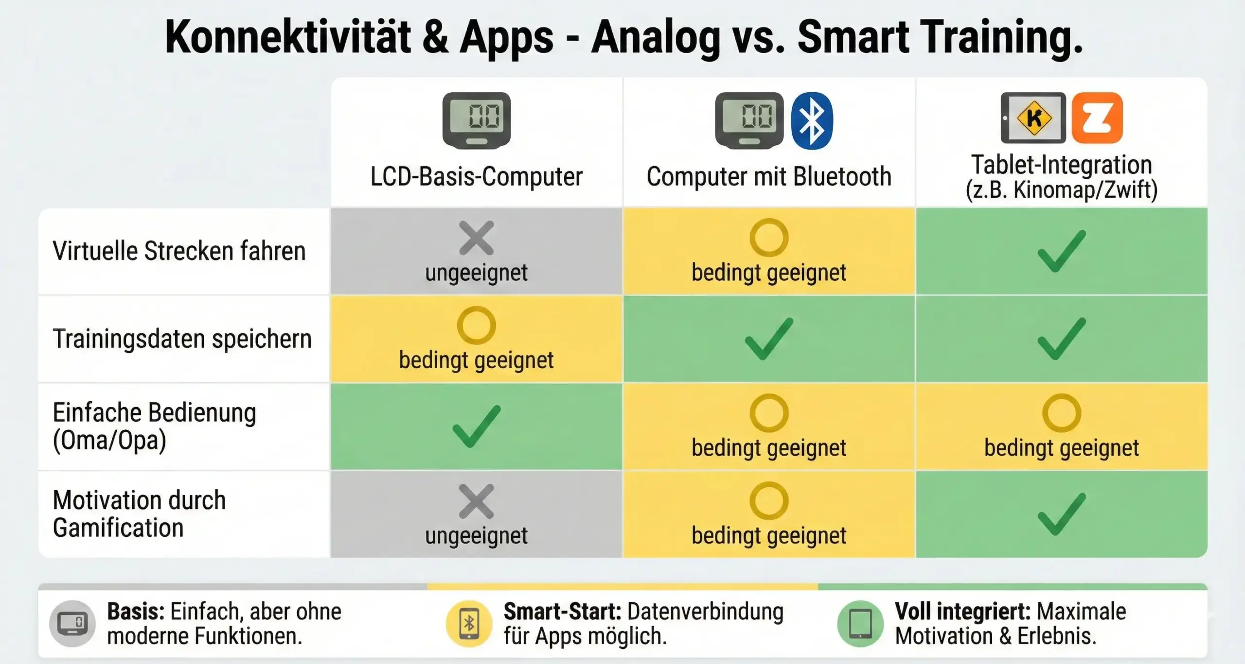 Kommen wir zur (meiner Meinung nach) klügsten und nachhaltigsten Lösung auf dem Markt. Hier kombinierst du ein hochwertiges Indoor-Cycle (nur die Mechanik) mit deinem eigenen Tablet, Smartphone oder Smart-TV. Das ist die perfekte Peloton-Alternative mit Zwift-Kompatibilität.