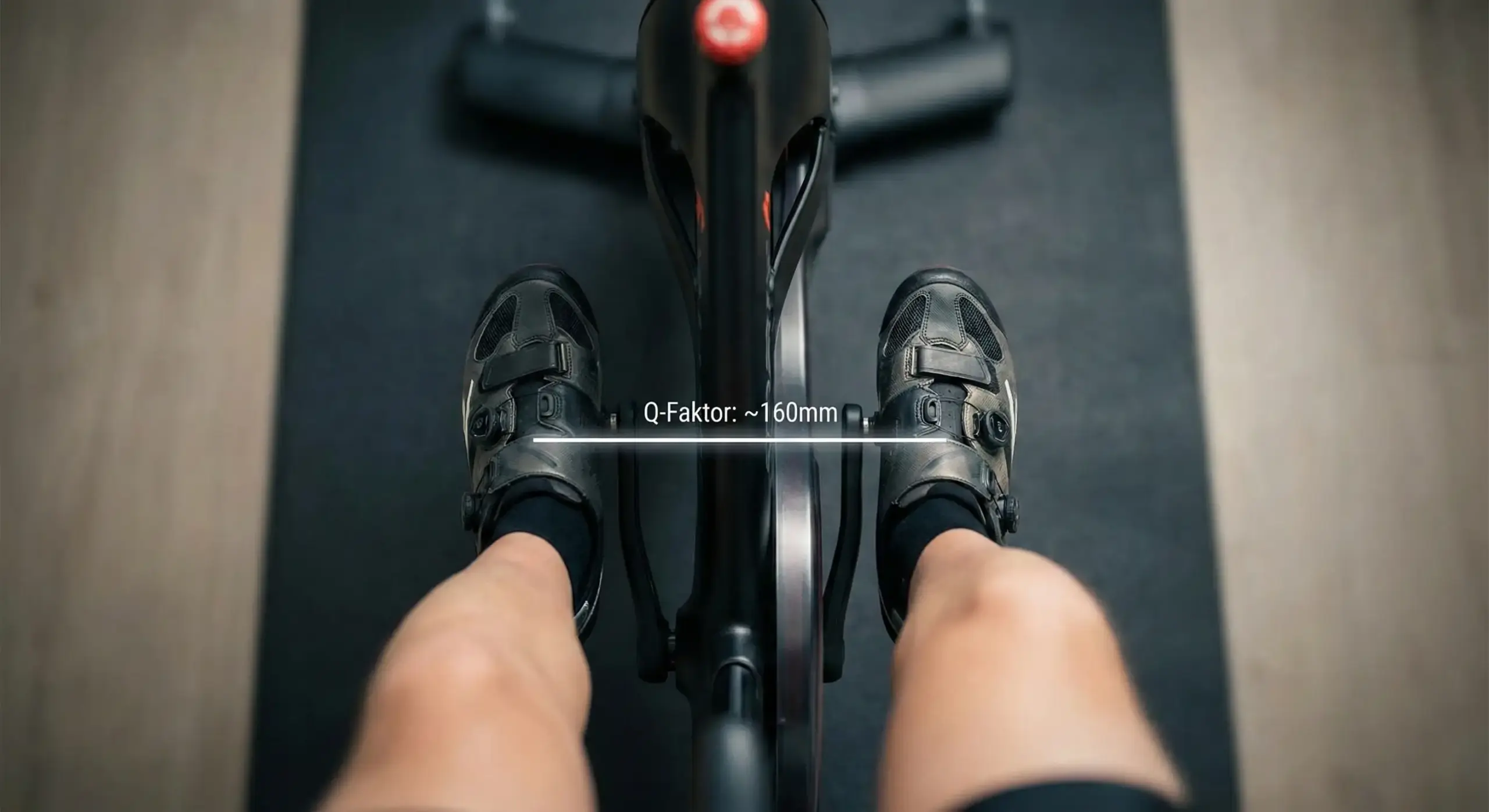Der Q-Faktor ist der seitliche Abstand zwischen den Pedalen. Das Peloton Bike ist mit ca. 170mm relativ breit konstruiert. Wenn du vom Rennrad kommst, fühlt sich das an wie „John Wayne“ – also sehr breitbeinig.