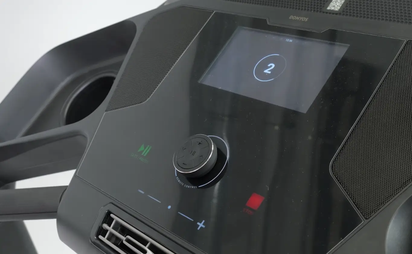 Ein weiteres Highlight, das wir in unserem Laufband Domyos Challenge Run 700 Test besonders schätzen lernten, ist die innovative Remote Control Fernbedienung. Diese wird via Magnet sicher an der Konsole festgehalten, kann aber bei Bedarf einfach abgezogen werden. Während des Laufens kann man sie bequem in der Hand halten, um die Grundfunktionen wie Tempo, Steigung oder das Pausieren des Trainings direkt zu steuern, ohne sich nach vorne zum Display beugen zu müssen. Dies erhöht nicht nur den Komfort, sondern auch die Sicherheit bei hohem Tempo signifikant.