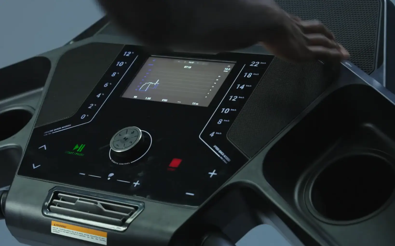 Für eine schnelle und intuitive Steuerung sorgen die integrierten Quick Access Tasten. Diese ermöglichen es uns, die Geschwindigkeit (4 bis 22 km/h) und die Steigung (0 bis 12 %) mit nur einem Tastendruck anzupassen – ein unverzichtbares Feature während intensiver Sprints.