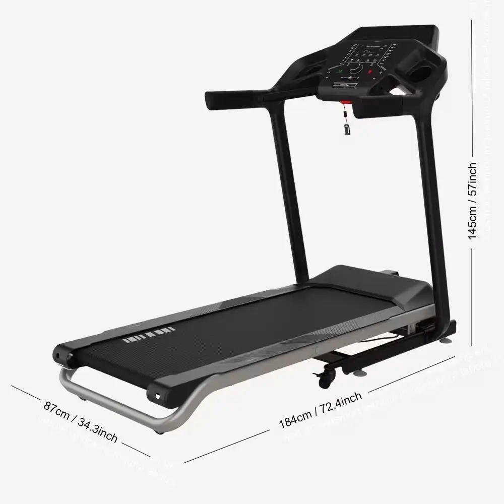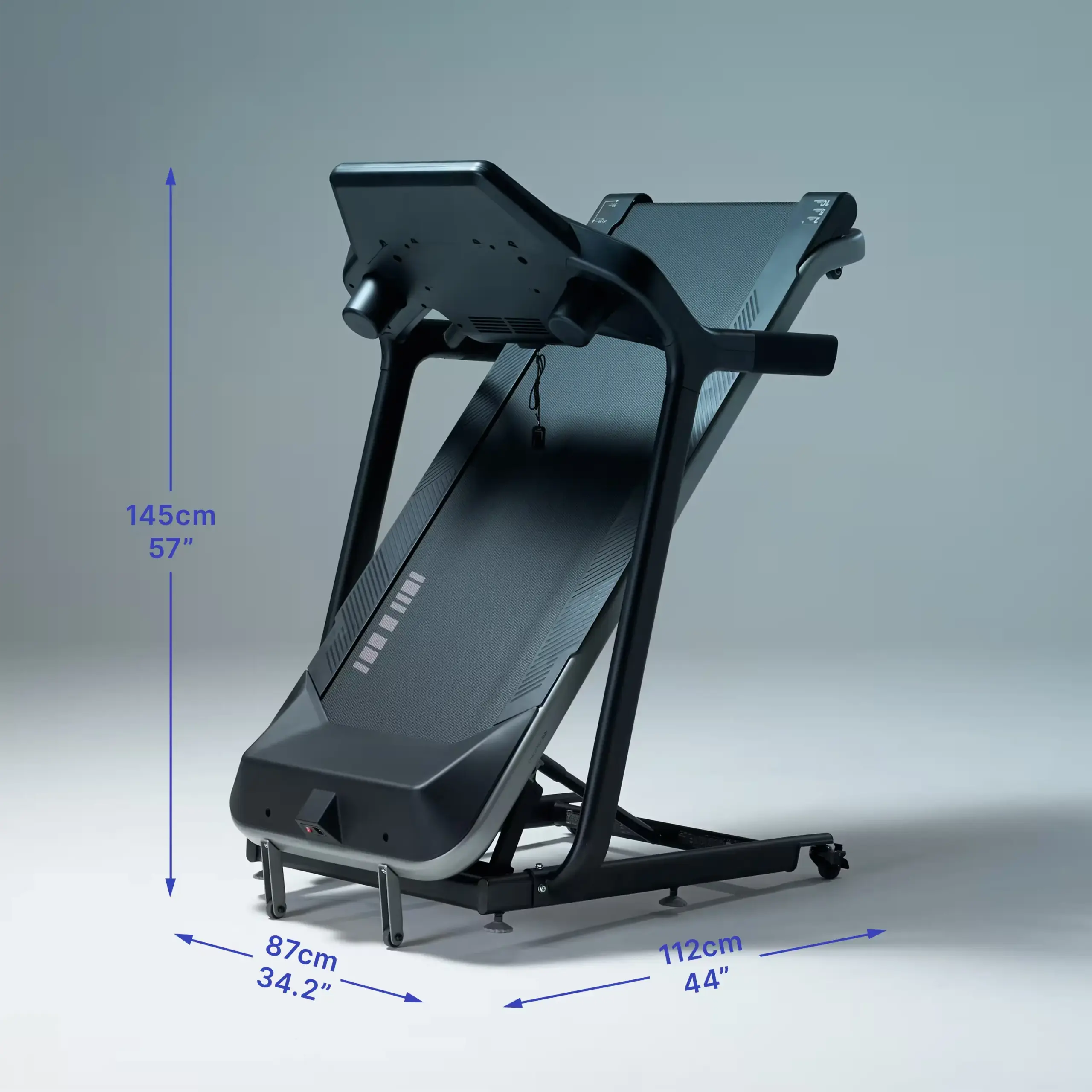 Mit den Aufstellmaßen von 184 x 87 x 145 cm benötigt das Gerät einen festen Stellplatz. Die Klappfunktion reduziert die Länge auf kompakte 112 cm, was für ein Laufband dieser Leistungsklasse ein guter Wert ist. Dank des hydraulischen Soft-Drop-Systems senkt sich die Lauffläche beim Aufklappen sanft und sicher von allein ab.