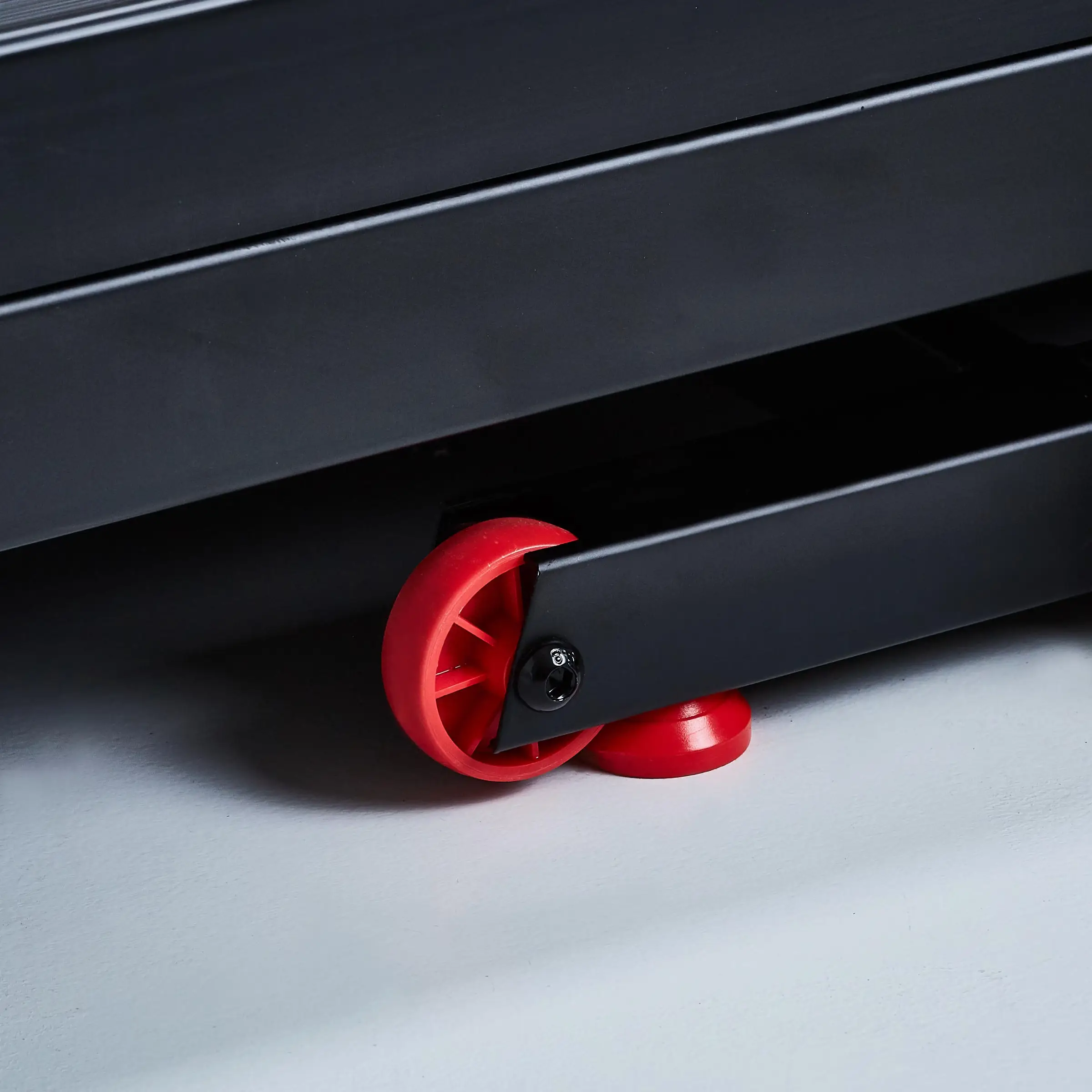 Das T520B ist ein echtes Raumwunder. Das Klappmaß beträgt lediglich 98 x 73 x 146 cm, was die Grundfläche fast halbiert. Dank eines hydraulischen Soft-Drop-Systems senkt sich die Lauffläche beim Aufklappen sanft von allein ab. In puncto Mobilität gibt es jedoch Licht und Schatten: Das hohe Gewicht von 62 kg macht das Verschieben mühsam, da die Rollen primär für das Schieben nach vorne konzipiert sind. Für Nutzer mit extrem wenig Platz empfehlen wir alternativ einen Blick auf einen Walking Pad Test