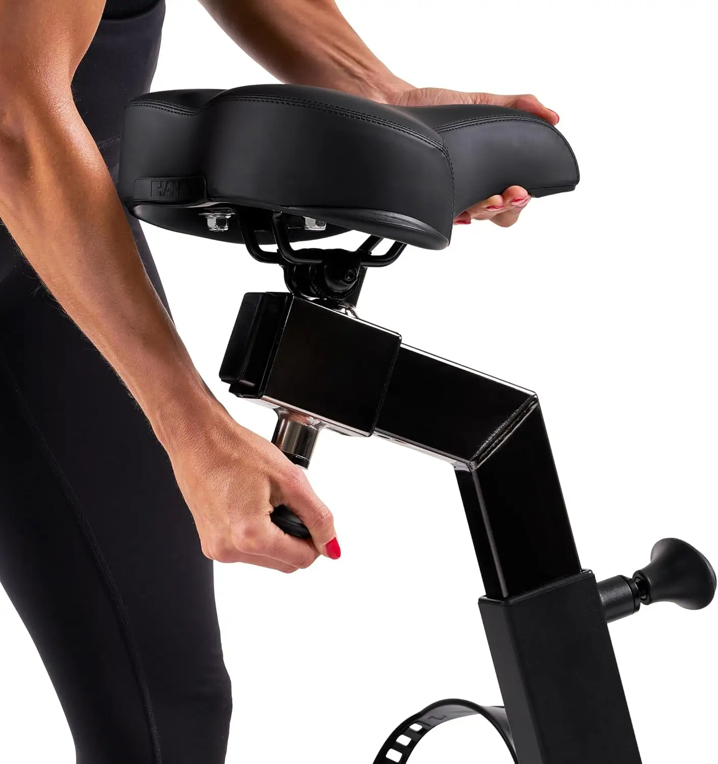 Ein oft unterschätzter Faktor ist der Q-Faktor (Pedal-Innenabstand). Beim Spheris 4.0 messen wir 20 cm. Wir empfanden diesen Stand als natürlich hüftbreit. Ein zu großer Q-Faktor (über 22 cm) kann bei schmaleren Personen zu Hüftproblemen führen, während ein Q-Faktor unter 18 cm oft nur bei reinen Indoor-Cycles zu finden ist. Mit den 20 cm bietet HAMMER hier einen gesunden Kompromiss, der ein sauberes Knie-Tracking ermöglicht. Wir beobachteten bei unseren Testern keine Ausweichbewegungen der Knie nach außen, selbst bei hohen Widerständen.