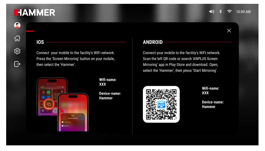 - Android-Nutzer: Hierbei wird die App „ANPLUS Screen Mirroring“ verwendet (via QR-Code auf dem Display schnell auffindbar), um das Handy mit dem Gerät „Hammer“ zu koppeln.