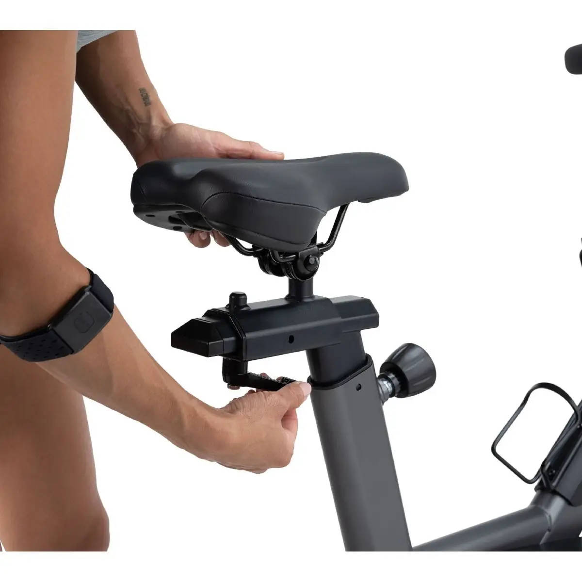 Wir bewerten ihn für die Mehrheit der Nutzer als akzeptabel, weisen jedoch Nutzer mit Knie- oder Hüftproblemen auf diesen Aspekt hin. Der Sattel ist für die sportliche Haltung essenziell und lässt sich vertikal und horizontal verstellen. Obwohl der ergonomisch gepolsterte Sattel vorhanden ist, stellten wir fest, dass für längere Einheiten ein Austausch gegen einen persönlichen Lieblingssattel (was problemlos möglich ist) sinnvoll sein kann.