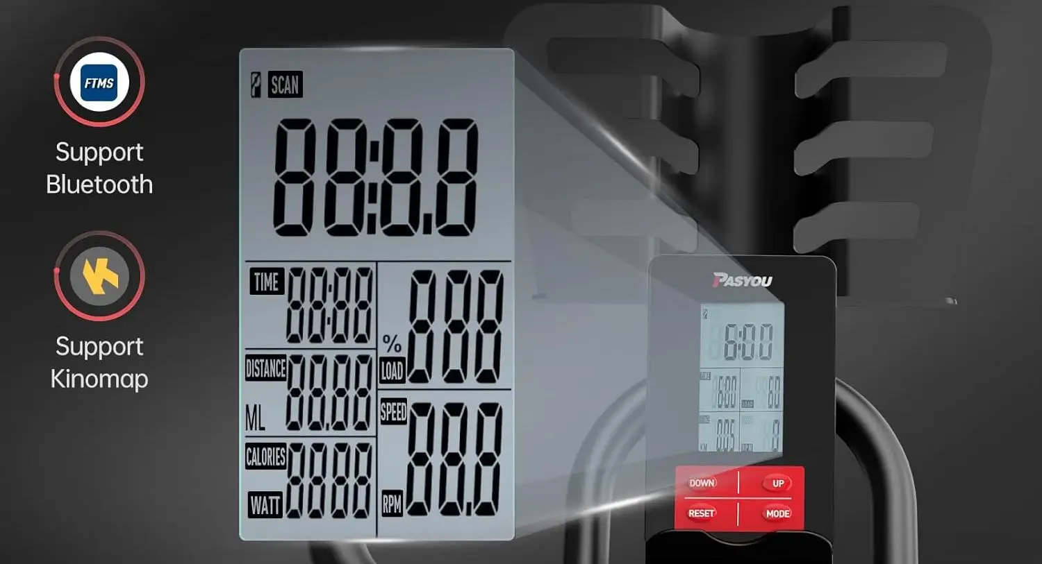 Das PASYOU S70 nutzt ein Magnetbremssystem, das auf sechs Magnete aufgerüstet wurde und 100 Widerstandsstufen (manuell einstellbar) bietet. Der Einstellbereich ist sehr groß und reicht von einer leichten Fahrt auf der Ebene bis hin zu einem extrem hohen Widerstand, der Bergetappen simuliert.