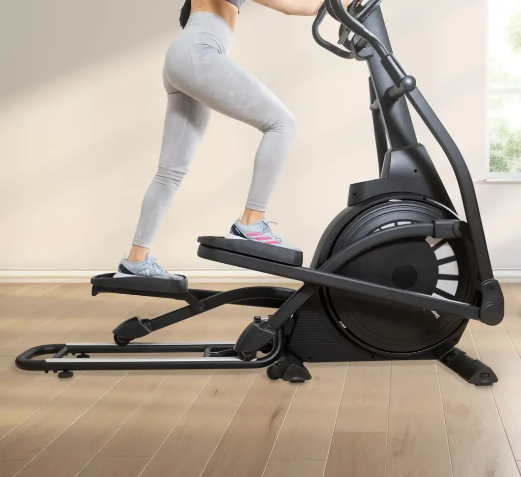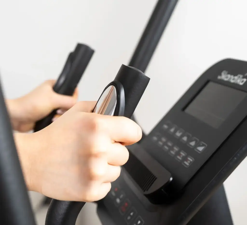Ein weiteres ergonomisches Highlight, das wir besonders hervorheben möchten, ist der extrem geringe Pedalabstand, der sogenannte Q-Faktor, von nur 7 cm. Dies ermöglichte eine sehr schmale, parallele Fußstellung, die der natürlichen Laufbewegung sehr nahekommt und Hüft- sowie Kniegelenke nach unserer Einschätzung optimal schont. Dies ist ein deutlicher Vorteil gegenüber vielen anderen Crosstrainern, die wir getestet haben. Die großen, rutschfesten Pedale boten dabei stets sicheren Halt. Die beweglichen Armstangen sind in ihrer Position jedoch fixiert. Während sie für durchschnittlich große Personen gut passten, könnten sie für sehr kleine oder sehr große Nutzer eventuell nicht die hundertprozentig optimale Griffposition bieten. Dies empfanden wir jedoch nur als einen kleinen Kompromiss angesichts der sonst hervorragenden Ergonomie.