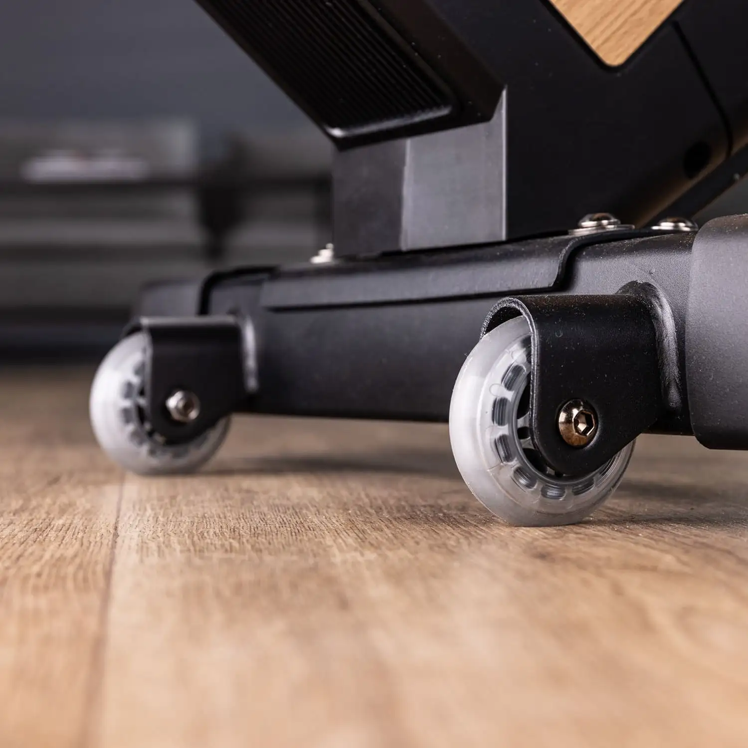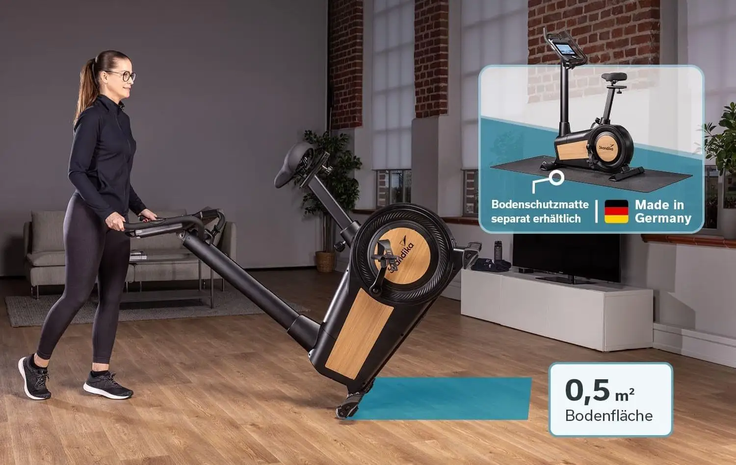 Mit den Maßen 103 x 52 x 156 cm benötigt das Gerät einen festen Platz im Raum. Da es nicht klappbar ist, richtet es sich eher an Nutzer mit einem dedizierten Trainingsbereich. Dank der Transportrollen lässt sich das 42,3 kg schwere Bike jedoch auf glatten Böden einfach verschieben. Das Gewicht sorgt hierbei für die nötige Bodenhaftung, ist aber beim Umstellen kein unüberwindbares Hindernis.