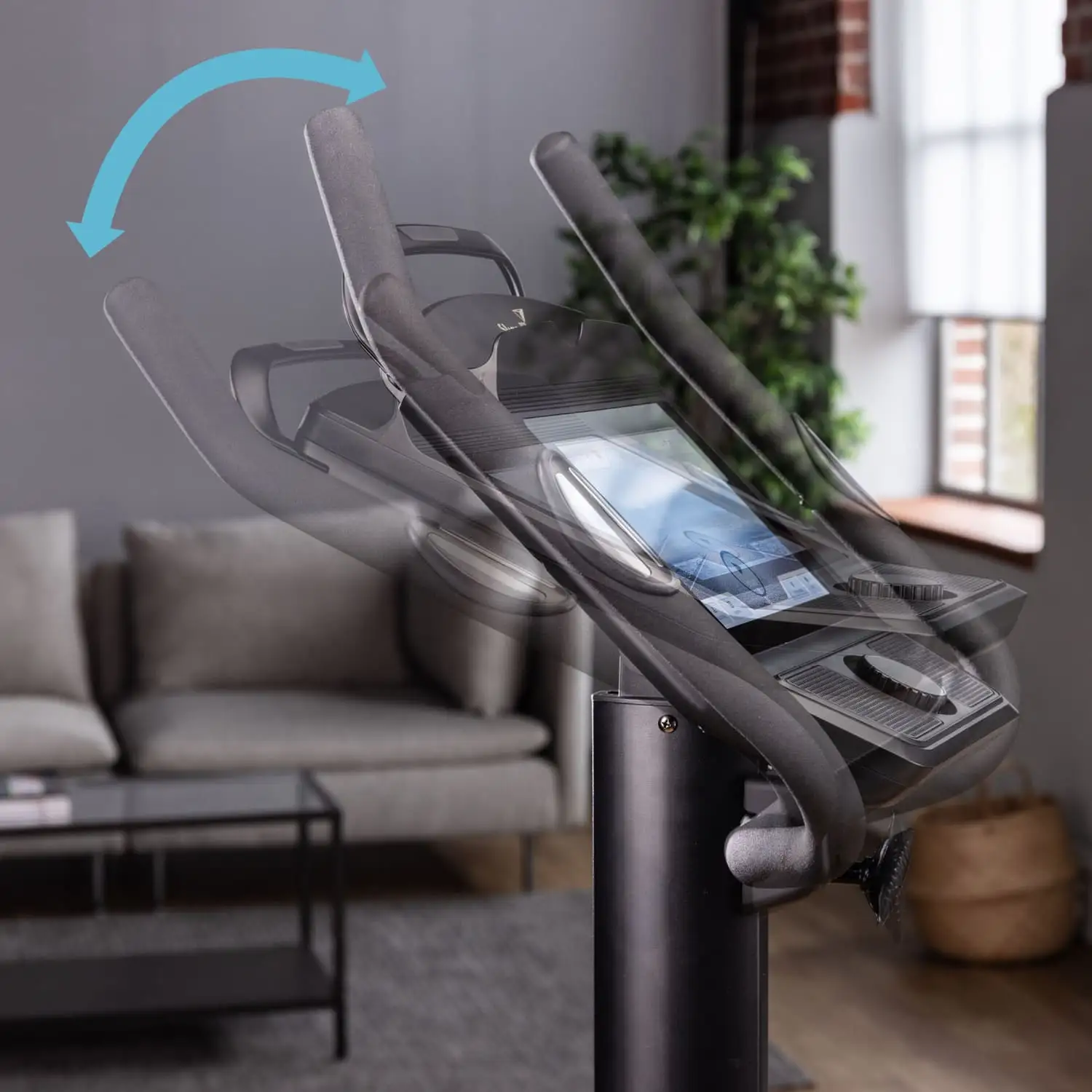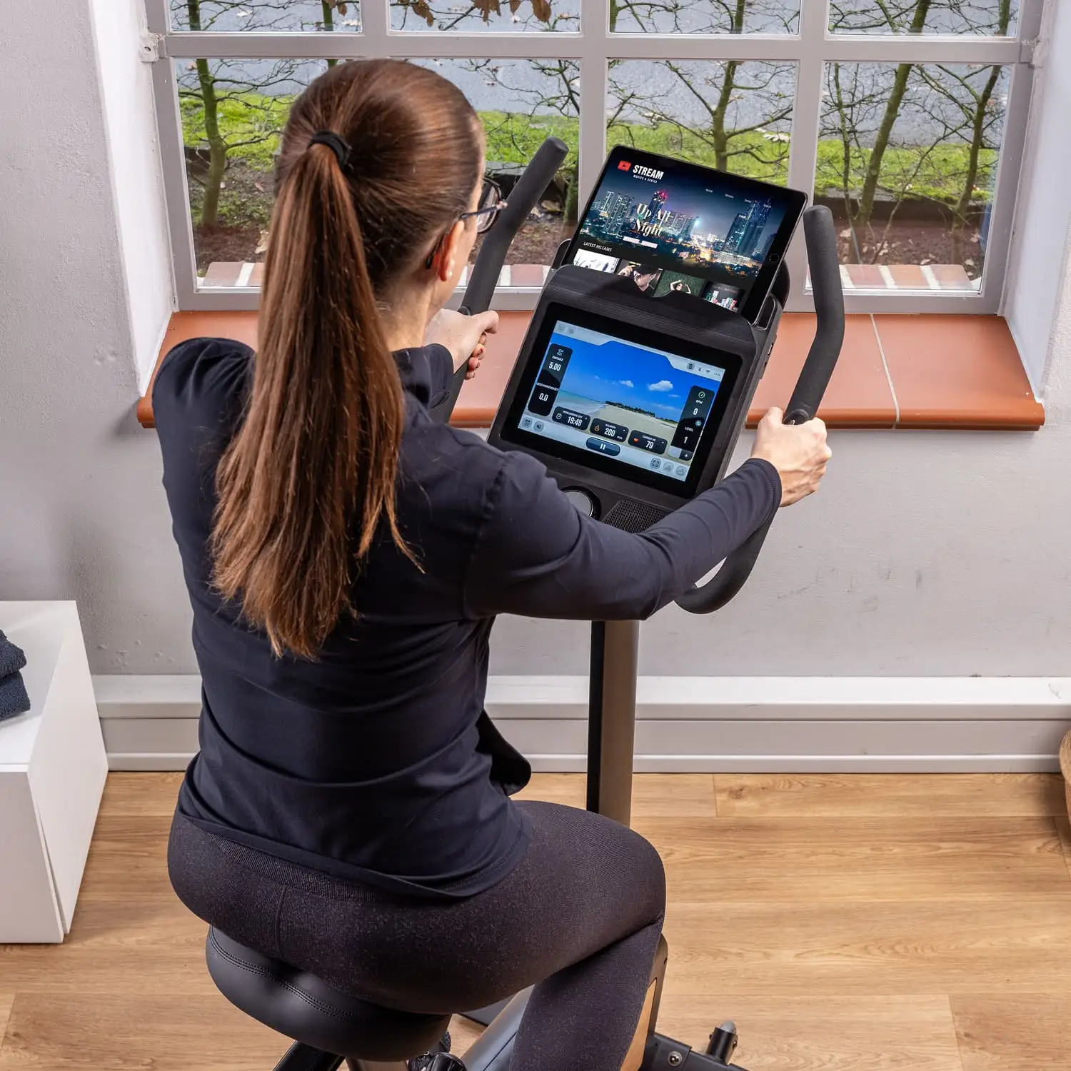 Betrachtet man die Verarbeitung im Detail, zeigt sich ein differenziertes Bild. Die tragenden Teile aus Stahl sind massiv und sauber pulverbeschichtet. Wir konnten keine unsauberen Schweißnähte oder scharfen Kanten finden. Die Konsole selbst wirkt durch das riesige 10,1 Zoll Display extrem futuristisch und ist das unangefochtene Zentrum des Bikes. Sie erinnert eher an ein modernes Cockpit als an ein herkömmliches Fitnessgerät.