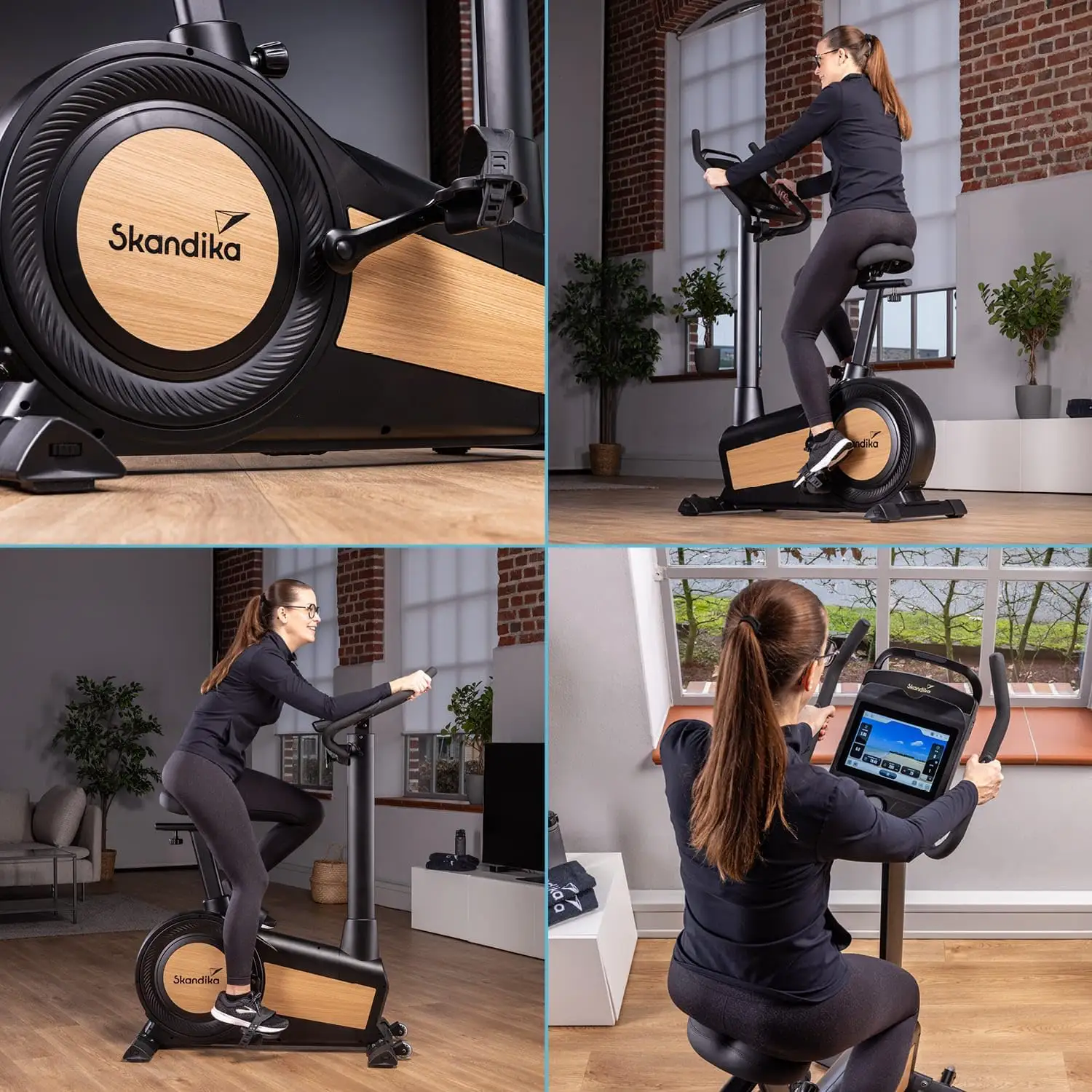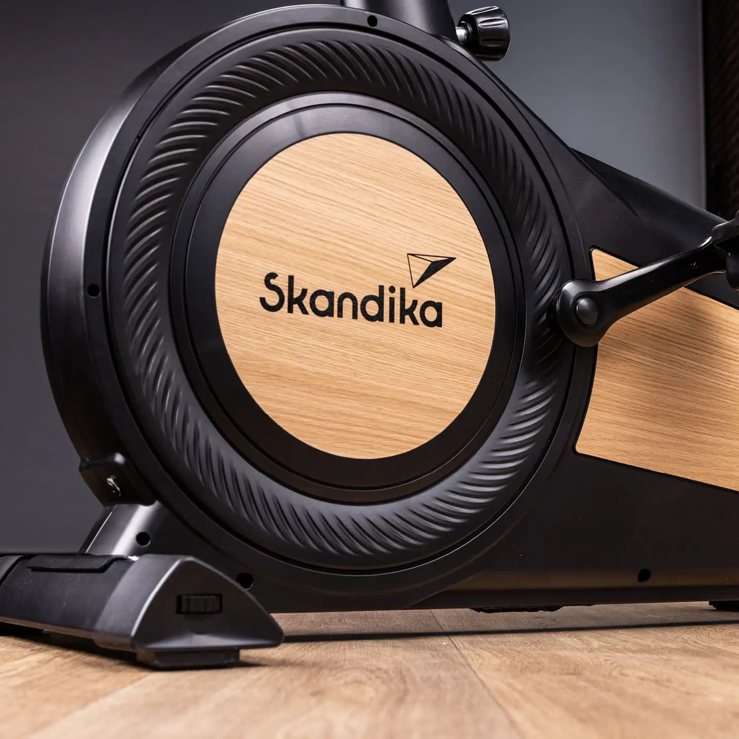 Schon beim ersten Blick auf das Gerät wird klar, dass Skandika hier versucht hat, moderne Technik mit wohnlichen Akzenten zu verschmelzen. Der erste Eindruck ist absolut positiv: Das matte Schwarz des Hauptrahmens wirkt edel und unaufdringlich. Ein echtes optisches Highlight sind die Applikationen in Holzoptik. Auch wenn es sich hierbei um Kunststoff handelt, verleihen diese Elemente dem Ergometer eine skandinavische Leichtigkeit, die wir so bei kaum einem anderen Modell im Ergometer Vergleich gesehen haben.
