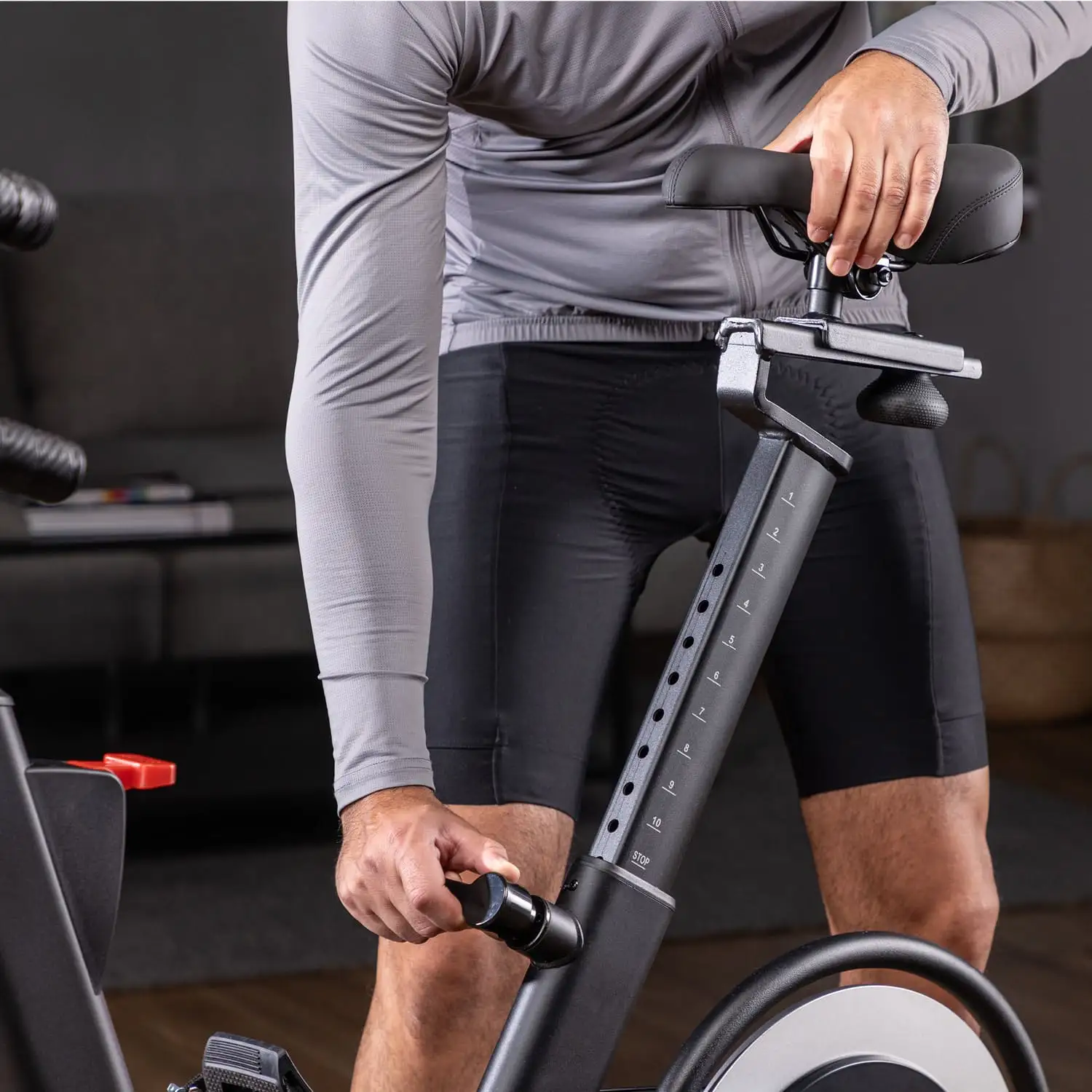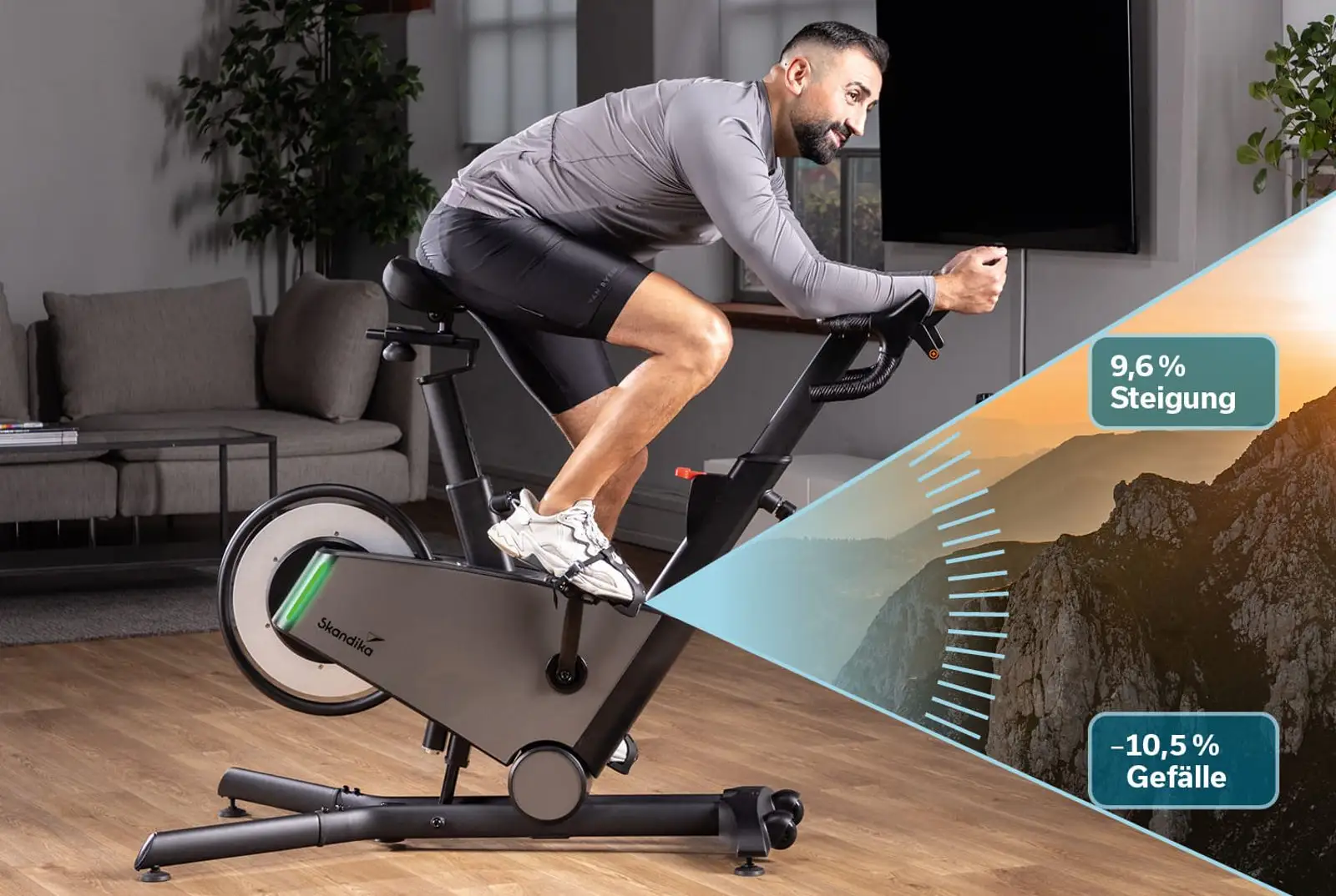 Die motorisierte Steigungsfunktion bietet insgesamt 16 Stufen und deckt eine beeindruckende Spanne von -10,5 % bis +9,6 % ab. Das Besondere ist hier die konsequente physische Umsetzung: Das gesamte Bike neigt sich realitätsgetreu vor und zurück. Bei einer simulierten Steigung hebt sich die Front deutlich an, was den Fahrer automatisch dazu zwingt, den Körperschwerpunkt nach vorne zu verlagern – exakt so, wie man es bei einer echten Bergfahrt in den Alpen oder im Schwarzwald tun würde.