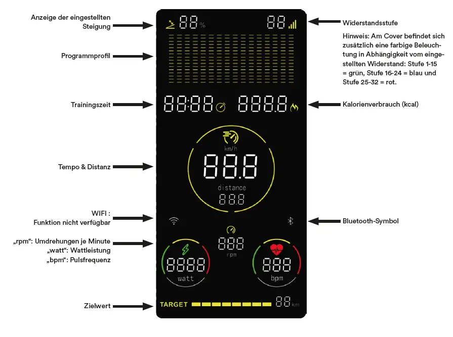 - Interaktive Neigung: Automatische Anpassung von Widerstand und physischer Neigung an das Geländeprofil.
