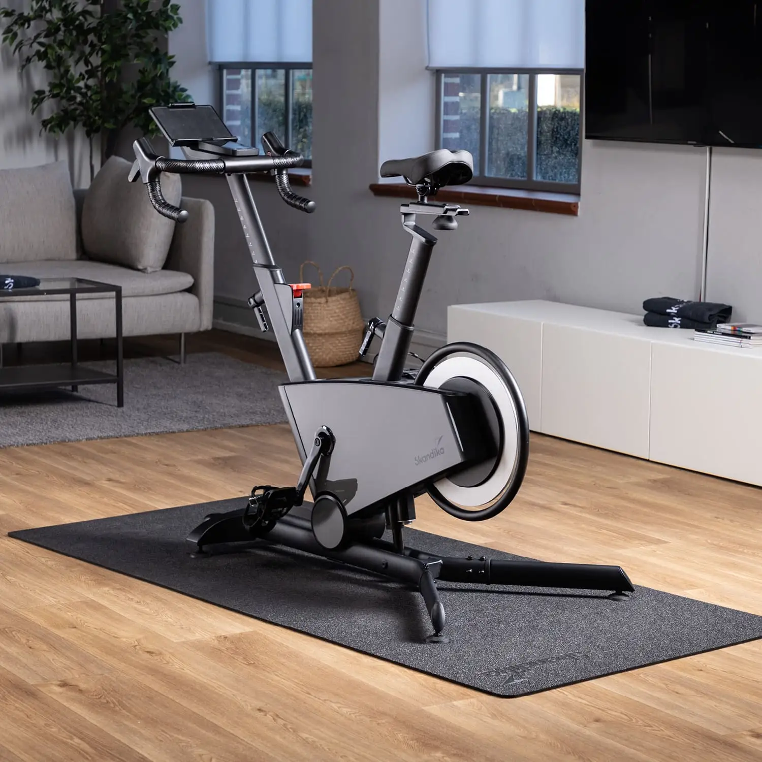 Der erste Eindruck beim Auspacken war durchweg positiv und unterstreicht den Anspruch eines Oberklasse-Heimtrainers. Das innovative Design mit dem hinten platzierten Schwungrad wirkt nicht nur modern, sondern hebt sich wohltuend von der Masse klassischer Speedbikes ab, die oft eher funktional-nüchtern daherkommen. Die Farbkombination in mattem Schwarz und Silber verleiht dem Gerät eine edle Optik, die sich harmonisch in moderne Wohnumgebungen integriert, ohne wie ein Fremdkörper zu wirken. Die Haptik der Griffe am Rennlenker ist hervorragend; das verwendete Griffband bietet eine angenehme Dämpfung, ist schweißresistent und auch bei längeren Einheiten extrem rutschfest.