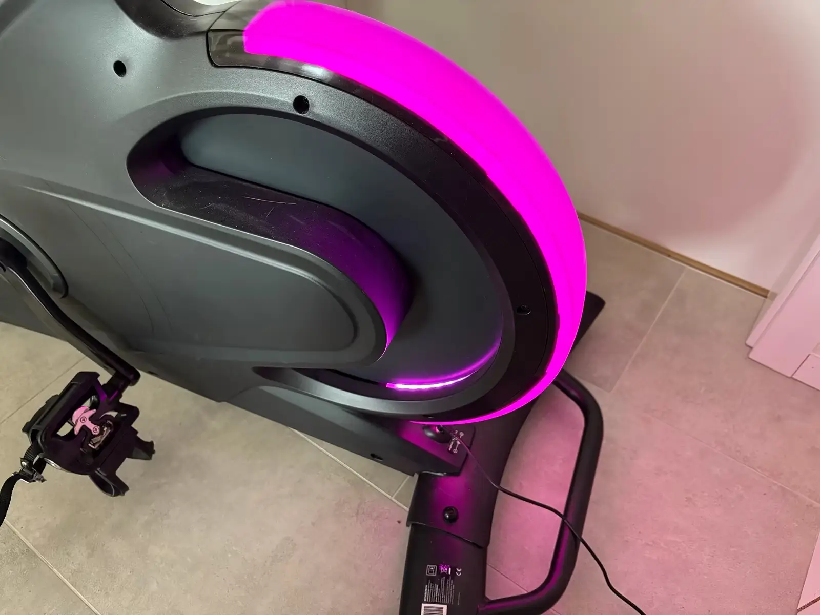 Die Materialqualität und Haptik sind für diese Preisklasse ausgezeichnet. Wir stellen fest, dass der Lenkerüberzug sehr angenehm zu greifen ist und auch ohne Radsporthandschuhe genügend Grip bietet. Ein besonderes Designmerkmal ist die hinten an der Schwungscheibe integrierte RGB-LED-Beleuchtung, die dem Bike einen futuristischen Look verleiht.