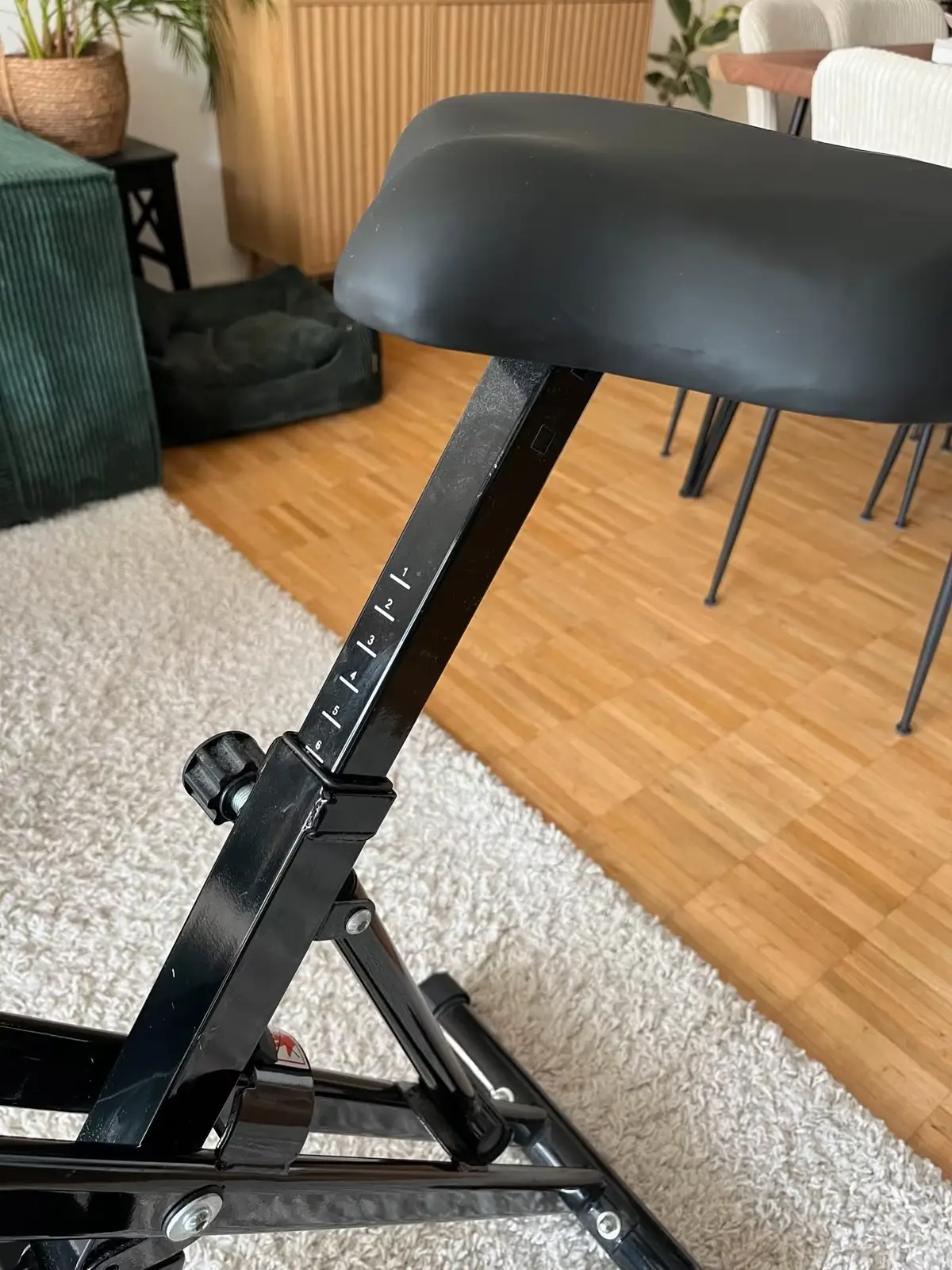 Der Relax-Foam-Sattel ist im Vergleich zu Wettbewerbern komfortabel. Dennoch ist er verbesserungswürdig: Er ist nur höhenverstellbar in 8 Stufen über einen 11 cm Verstellbereich. Eine horizontale Sattelverstellung fehlt komplett. Wir mussten leider feststellen, dass der nicht einstellbare Sattelwinkel bei manchen Nutzern (insbesondere männlichen) nach ca. 30 Minuten zu Taubheitsgefühlen im Dammbereich führen kann, da der Druck nicht optimal verteilt wird.
